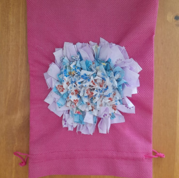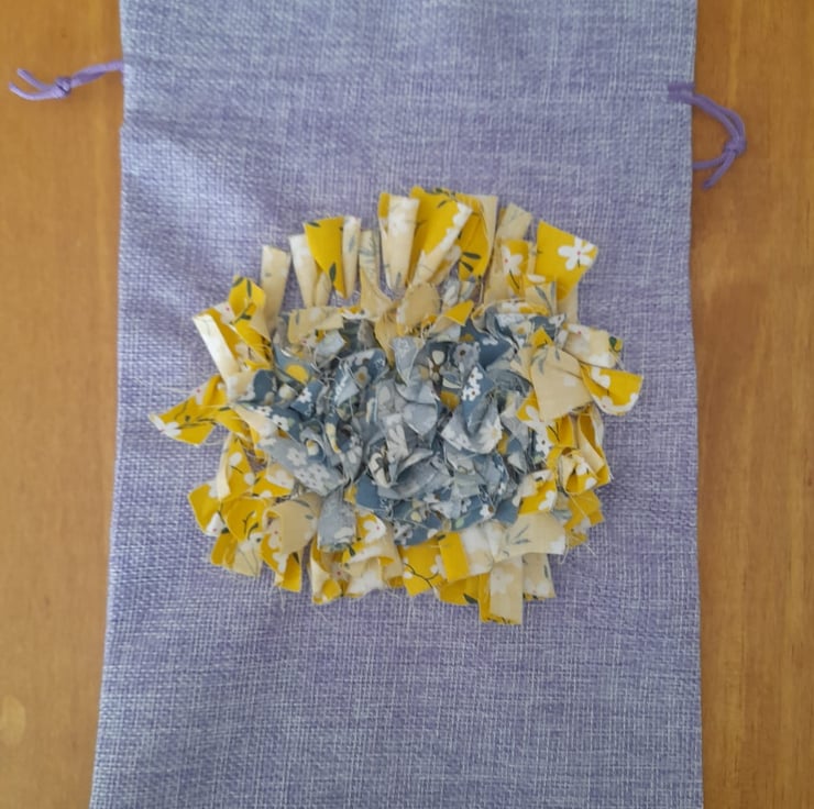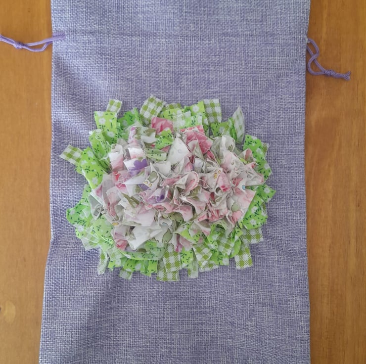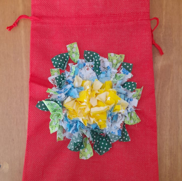 A beautifully handcrafted drawstring bag (20x30 cm) made from hessian-style fabric, featuring a vibrant rag rug floral bloom. Perfect for gifting, storage, or simply adding a touch of playful cottage charm to your everyday. Handmade with care and bursting with texture and colour.