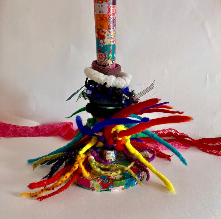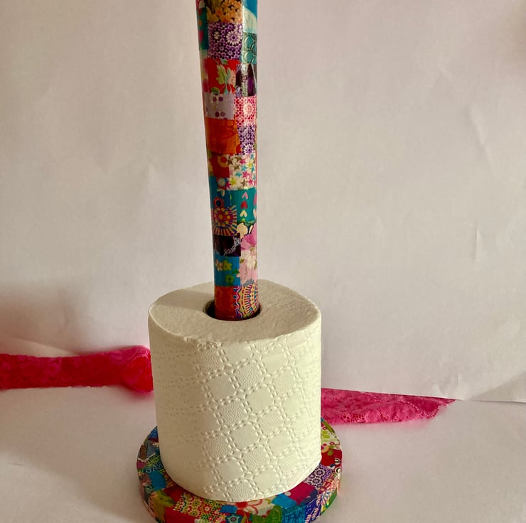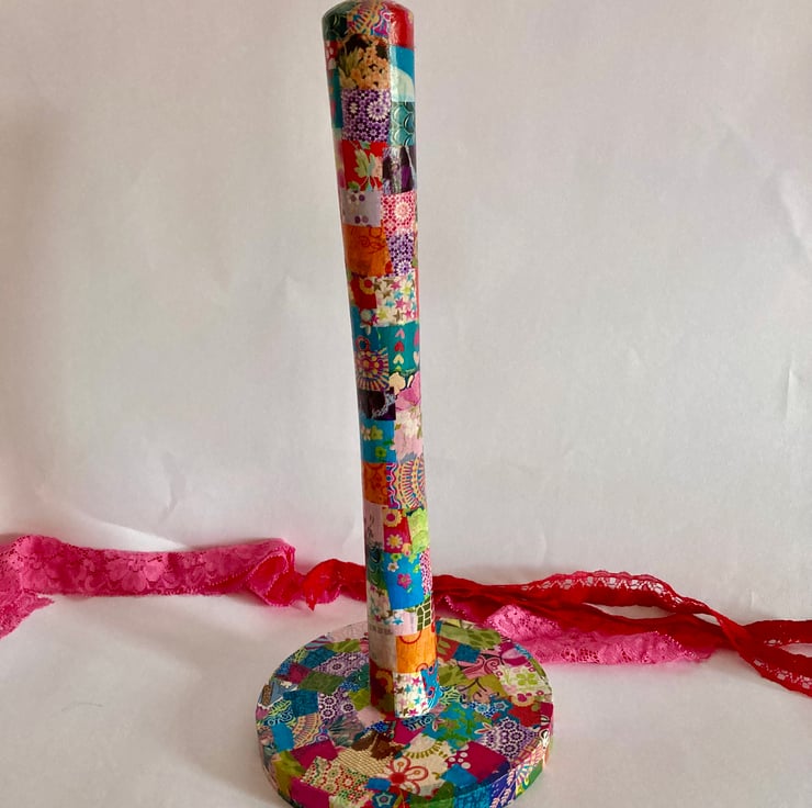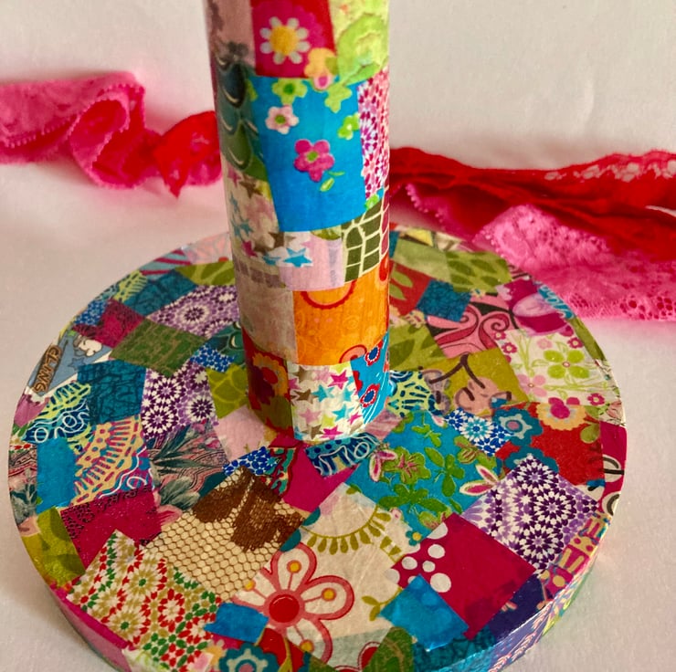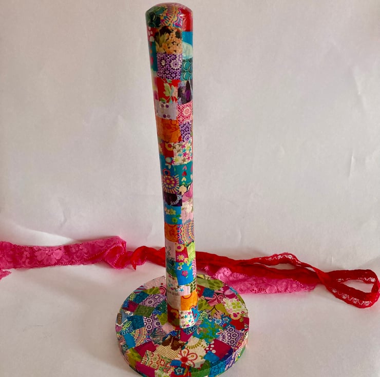 This is a quirky up cycled, wooden kitchen roll holder which had been rescued and cleaned up ready to be decorated