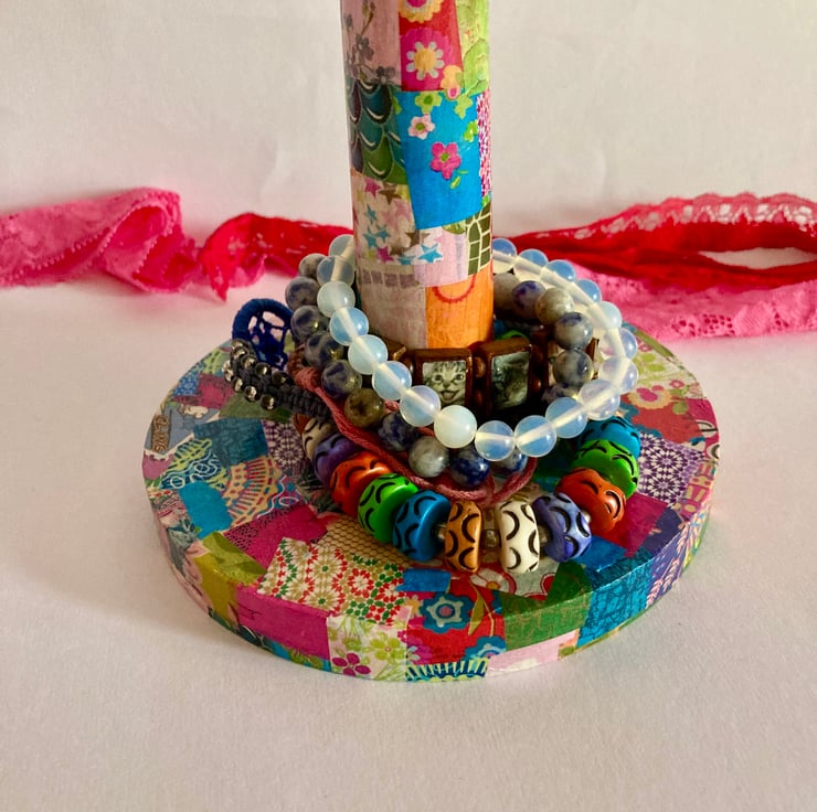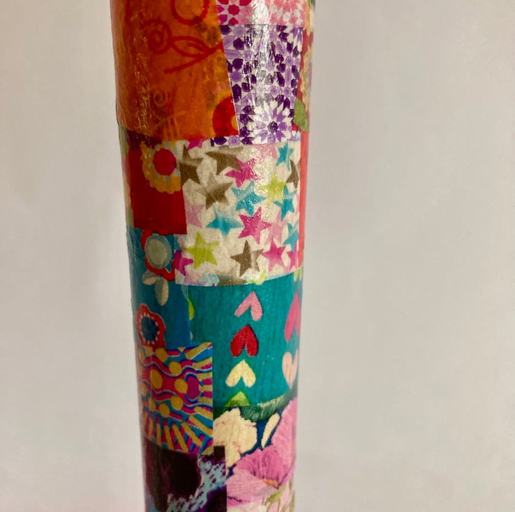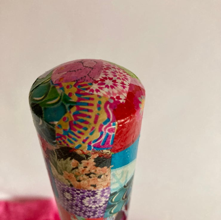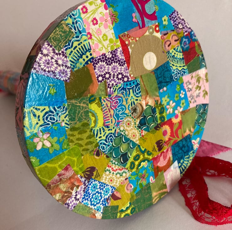 I have used a variety of bright and cheerful decopatch papers over the whole surface. It has then been varnished for extra durability.