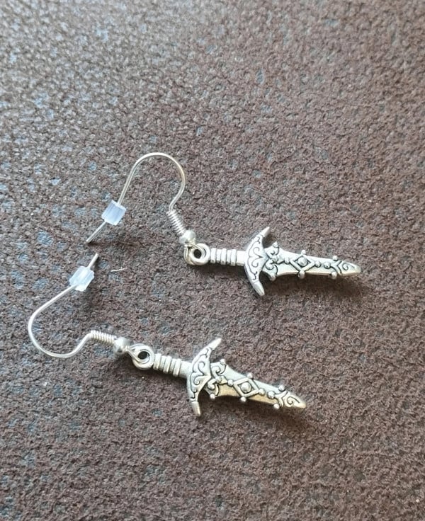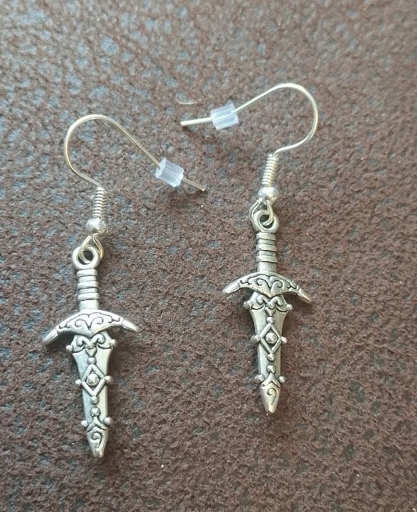 Gorgeous tibetan silver ornate dagger / sword earrings, plated silver hooks, the charm is 2.8cm x 1.3cm, they will come with the stoppers.
