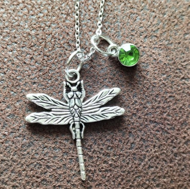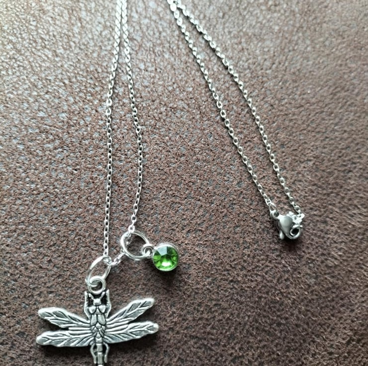 This Tibetan silver dragonfly and green CZ charm necklace features a dragonfly pendant with a green CZ charm on an 18-inch stainless steel chain.