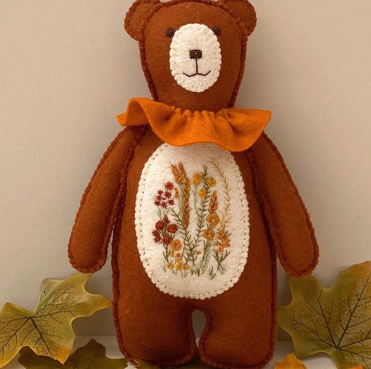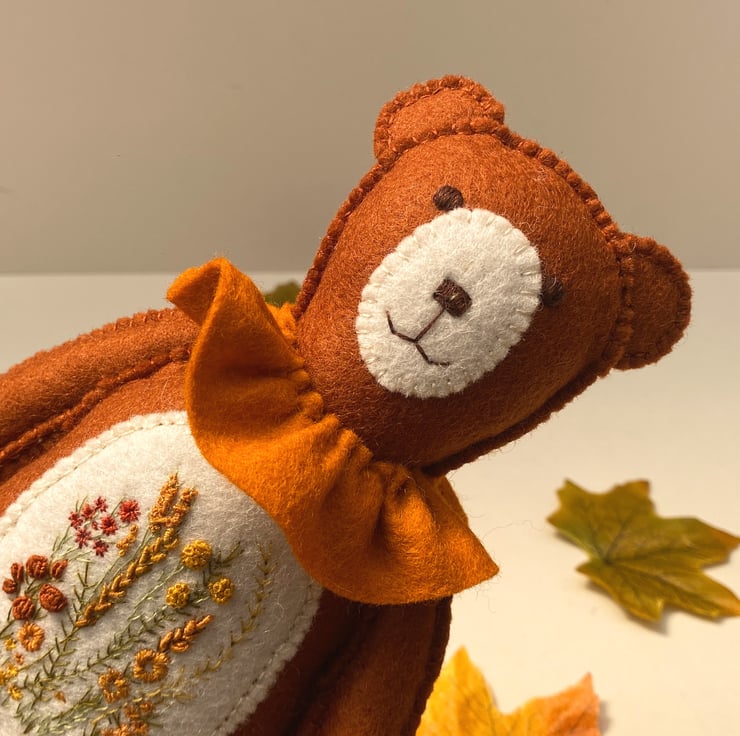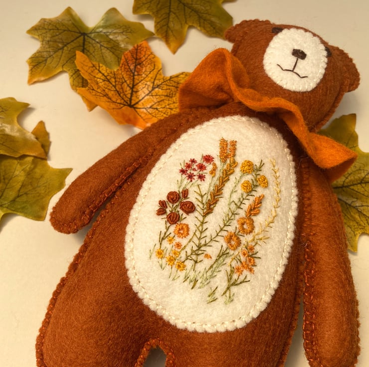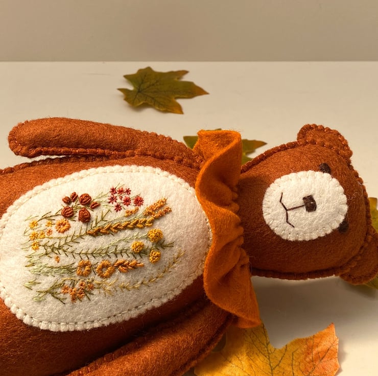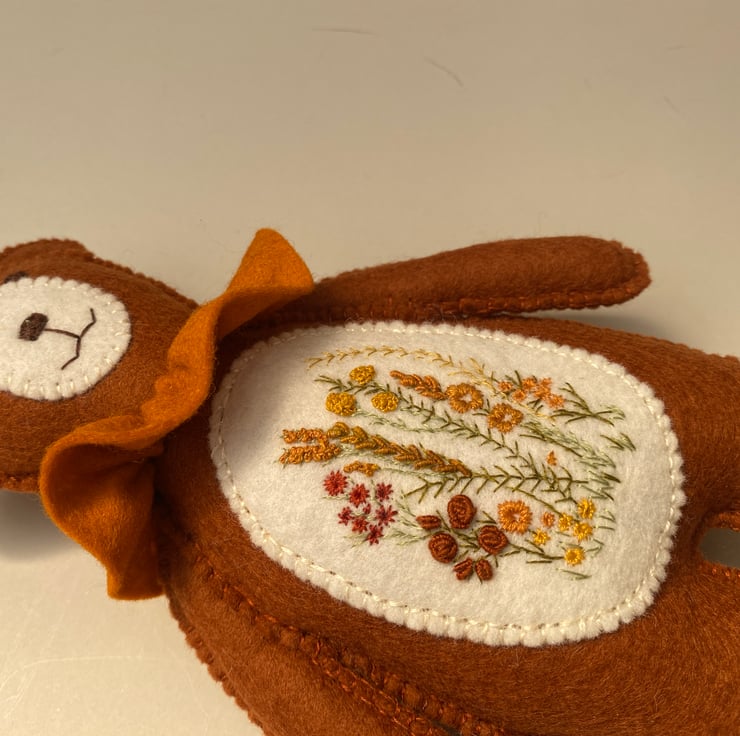 Made from 100% wool felt in gingerbread with contrast ivory felt to his tummy which is highly decorated with delicate hand embroidered florals in oranges, rusts, gold and greens. He has triple hand sewn seams for stability and decoration.