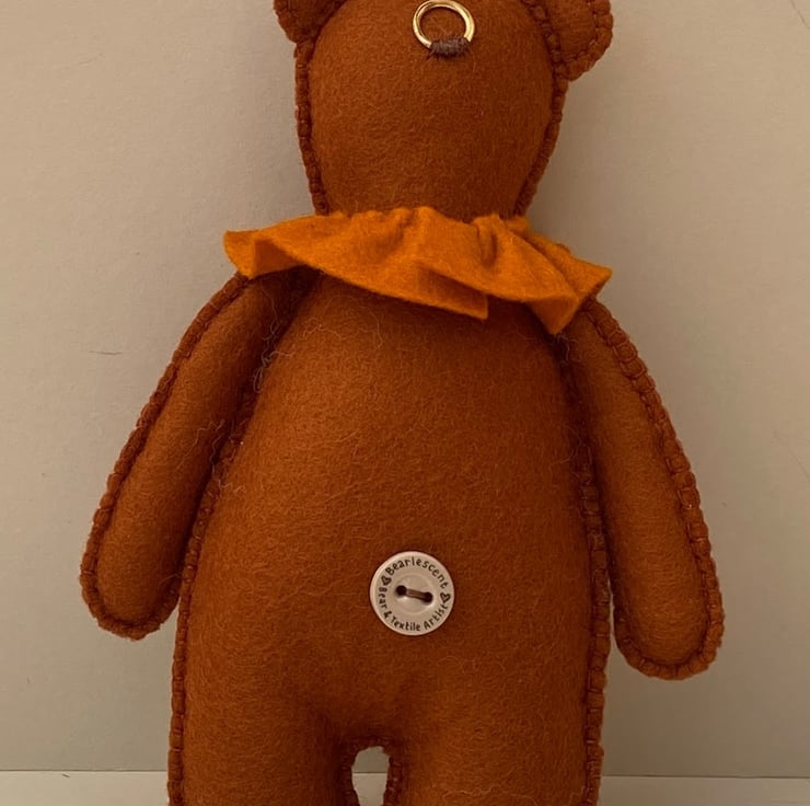 A little woodland bear approx 7.5" tall designed as a decorative item to stand (when propped) or to be hung on a wall from a little brass ring to the back of his head.