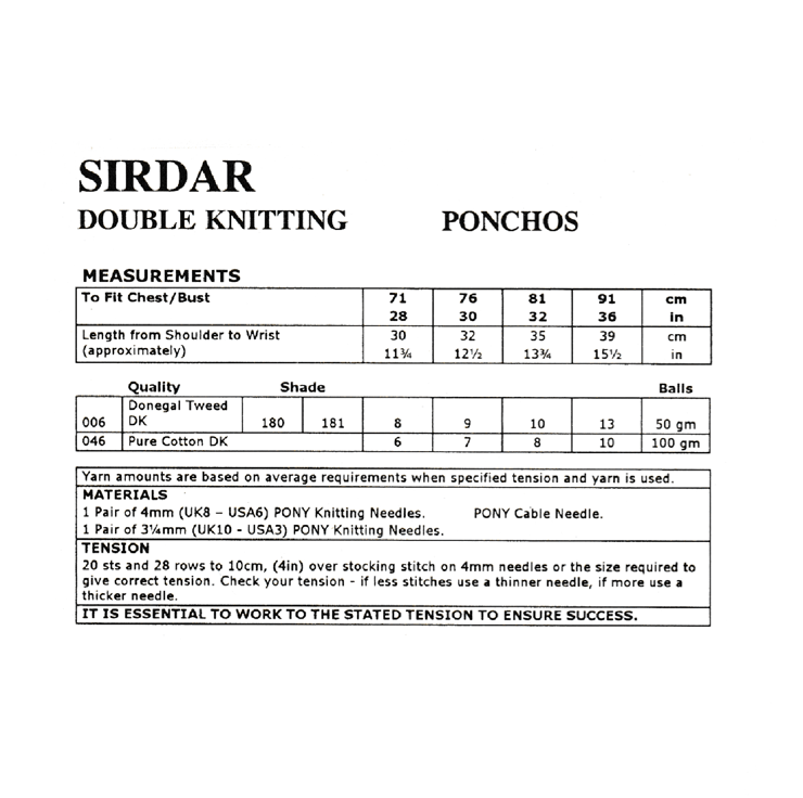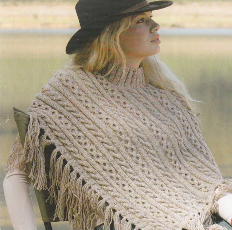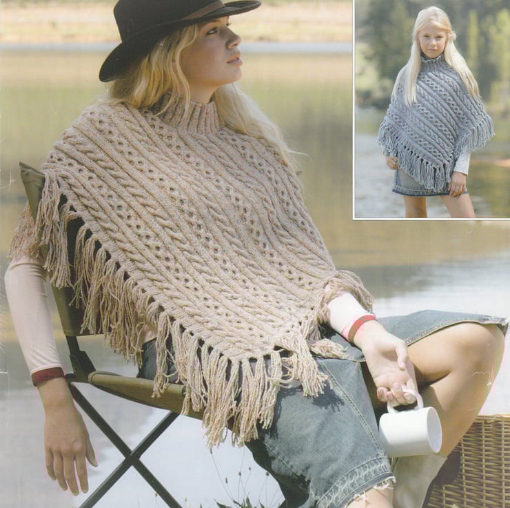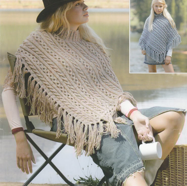 This hand knit PATTERN is for a ladies poncho. To fit chest: 71 to 91 cm or 28 to 36 inches. Knitted in double knitting yarn using 3.25 mm and 4 mm knitting needles.