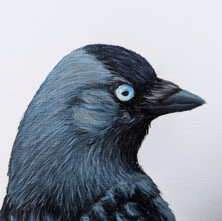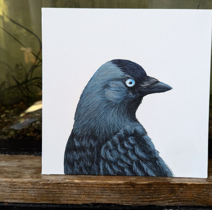 An awkward 7.8" x 7.8" painting, by myself, of a simple but beautifully blue Jackdaw.
