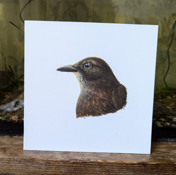 An approx 8" x 8" acrylic painting of a female Eurasian Blackbird, inspired by the lovely lady that frequently visits my garden.