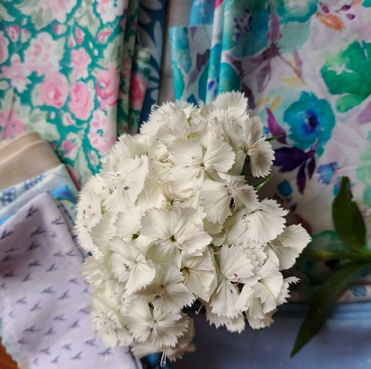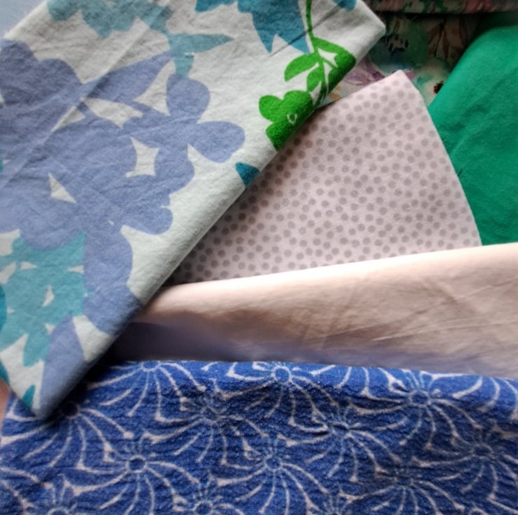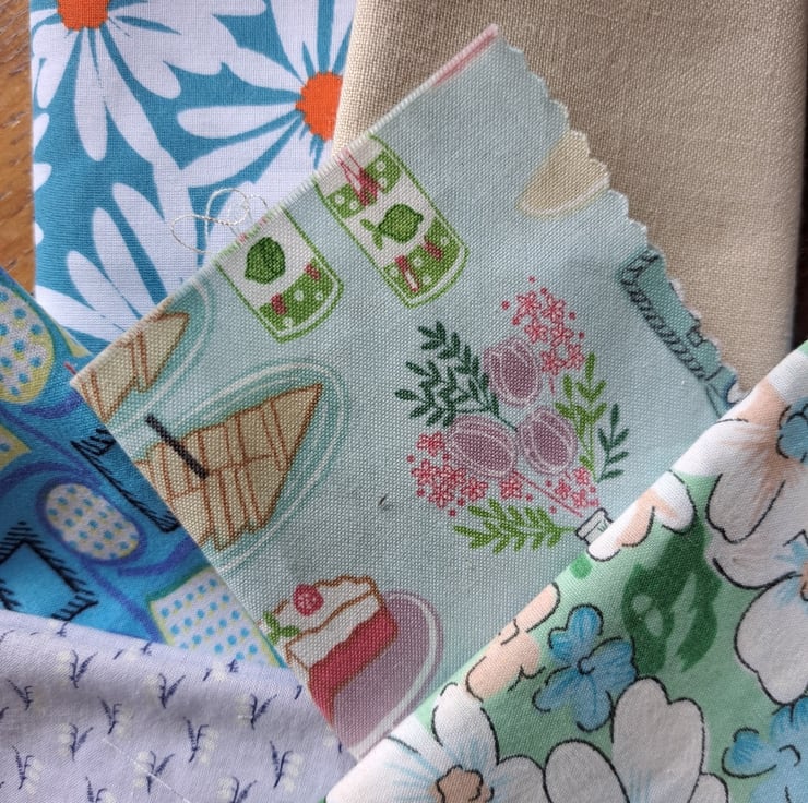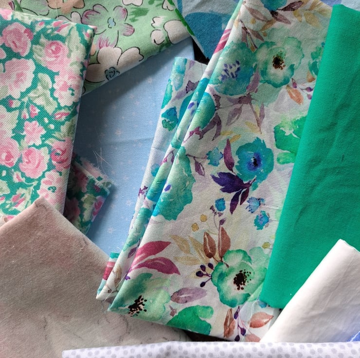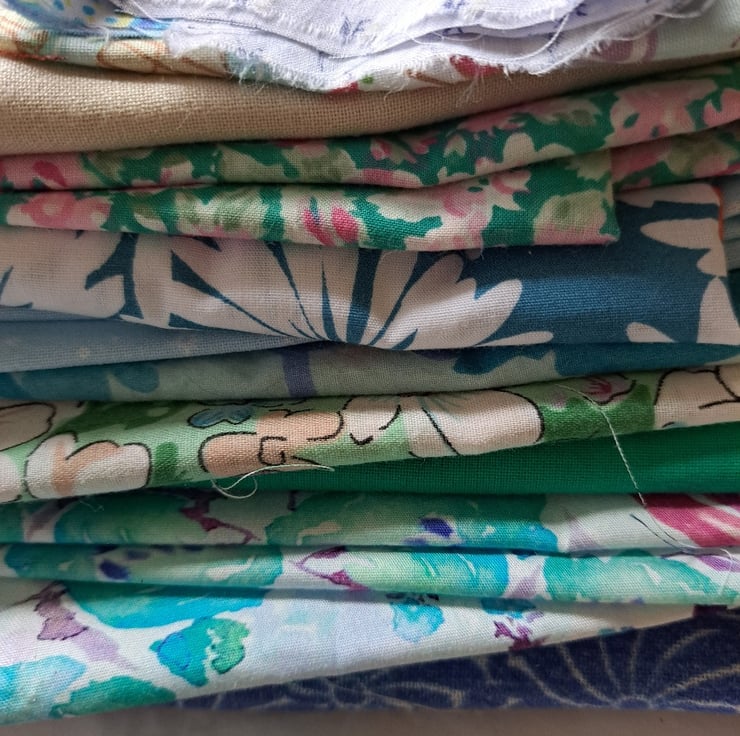 Shades of aqua, turquoise, beige and mint... all the colours of the traditional wedding guest. Fifteen good-sized pieces of vintage, rescued and remnant cotton and cotton lawn (one unidentified material), in crisp and cool tones. All that's missing is the fascinator.