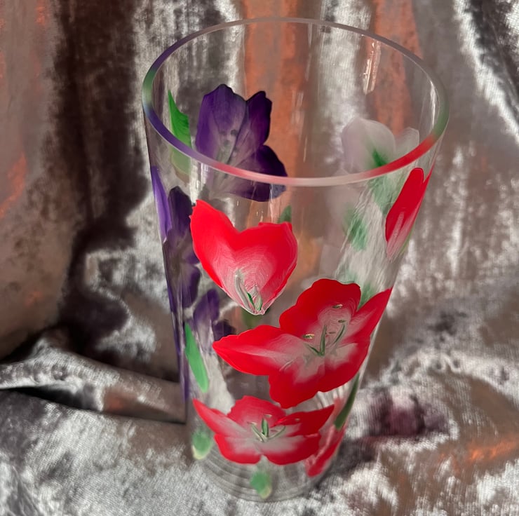 Looking for a truly special gift? This charming Hand-Painted glass vase is sure to delight! Featuring a vibrant , floral design, it's paired perfectly with a matching gift bag. Designed for everyday enjoyment, this unique glass is both usable and hand washable, making it a thoughtful and lasting present. All my glassware is individually hand painted in my studio and is unique.