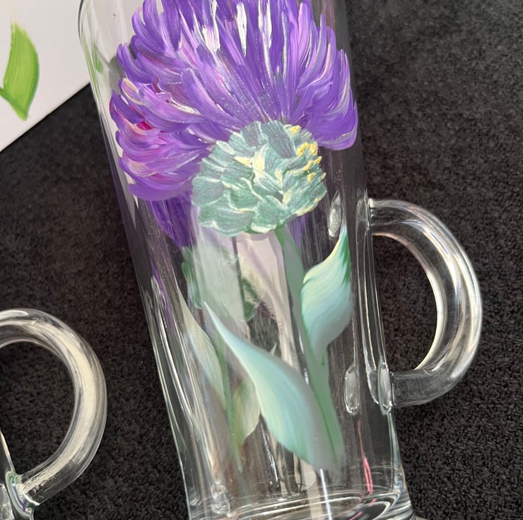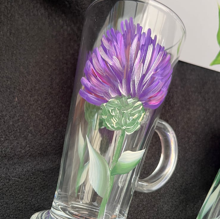 A pair of individually hand painted latte glasses depicting the Scottish Thistle. These glasses come with a matching hand painted gift bag and tag. A perfect gift for any occasion.