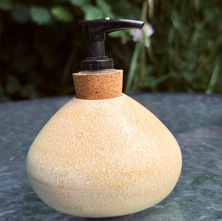 Hand thrown stoneware soap dispenser with pump. Creamy yellow colour