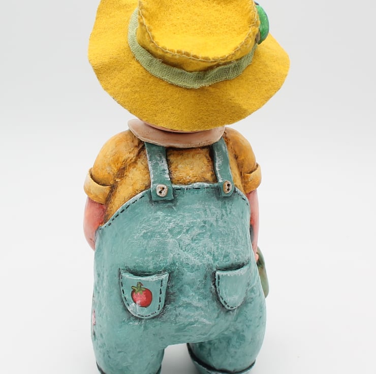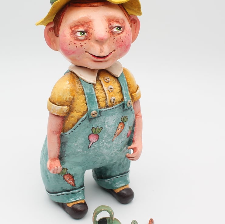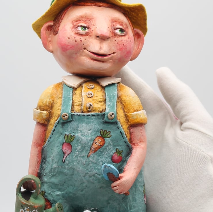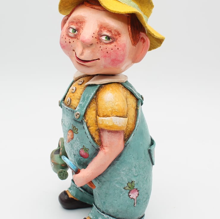 Meet Alfie the Gardener – a charming, one-of-a-kind art doll crafted in a vintage style. Handmade from paper clay, painted with acrylics, and sealed with protective varnish. His head gently moves, bringing more personality to this whimsical character. Toby is dressed like a gardener from a forgotten storybook, full of warmth and quiet humour.