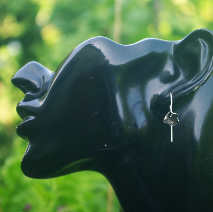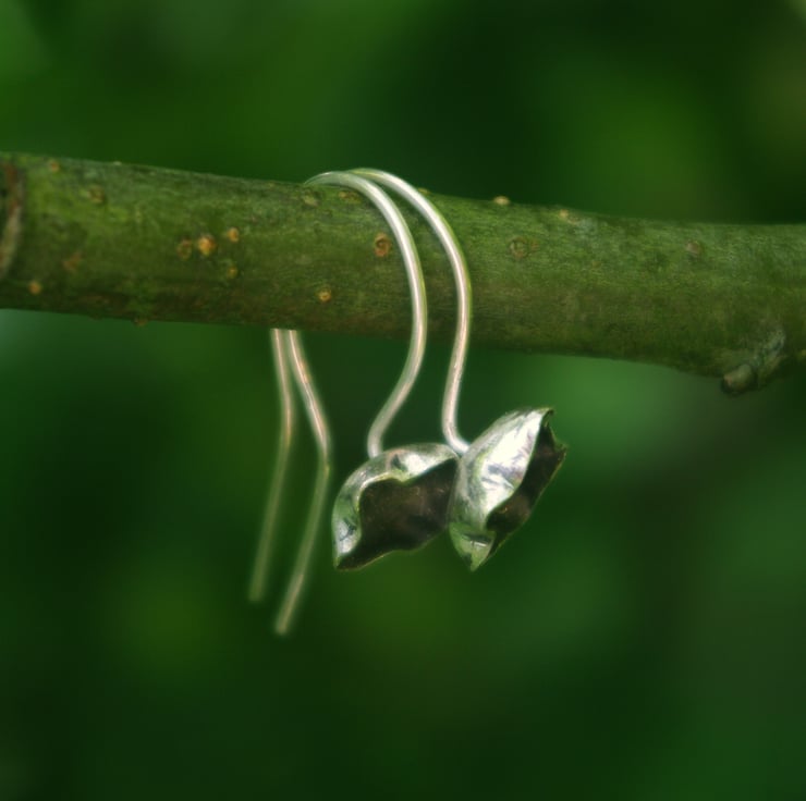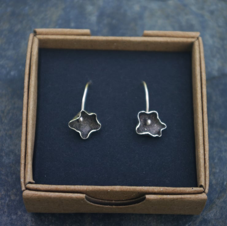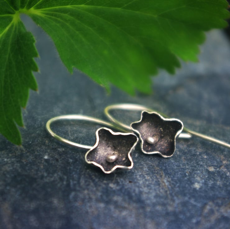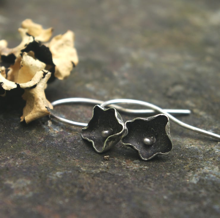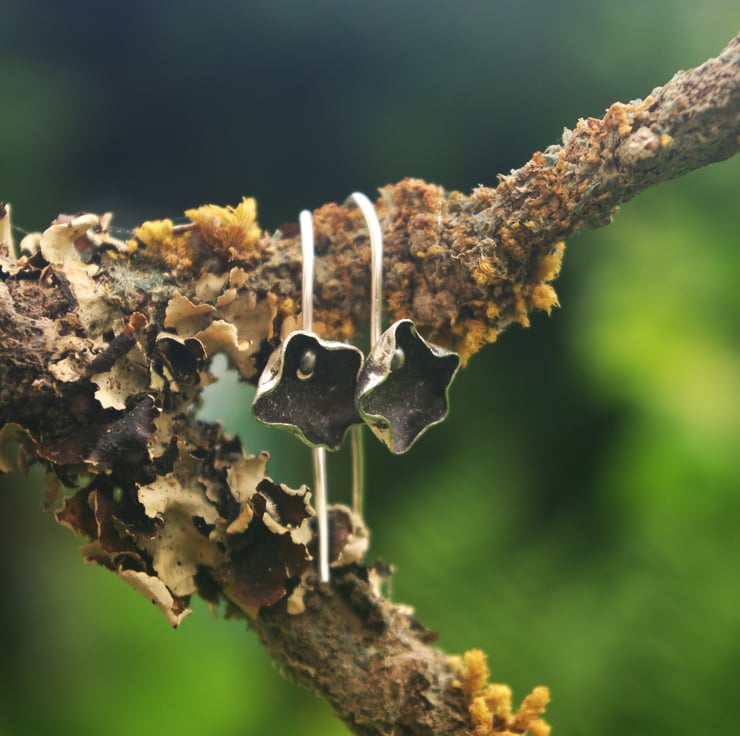 Oxidised eco sterling silver earrings , inspired by lichen with a dangle of 20mm/ 0.75inches .The earhook is handmade from eco sterling silver and the lichen piece moves about freely and hangs at a slight angle , so that the dark , oxidised inside and shiny outside are both visible.