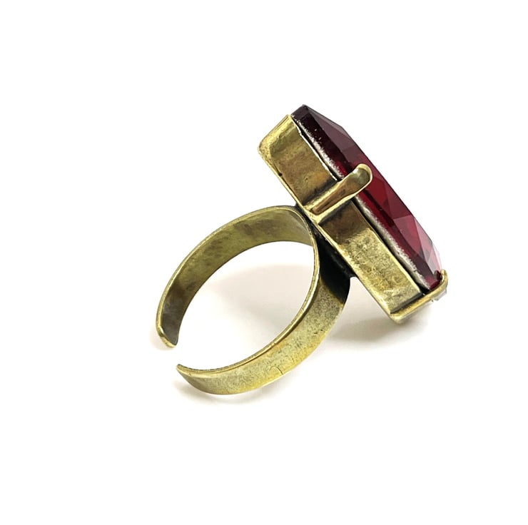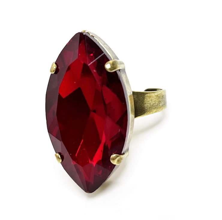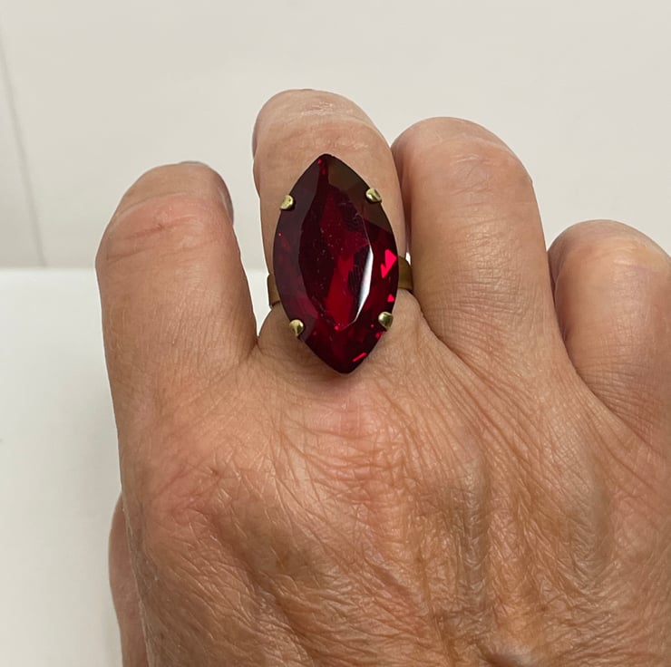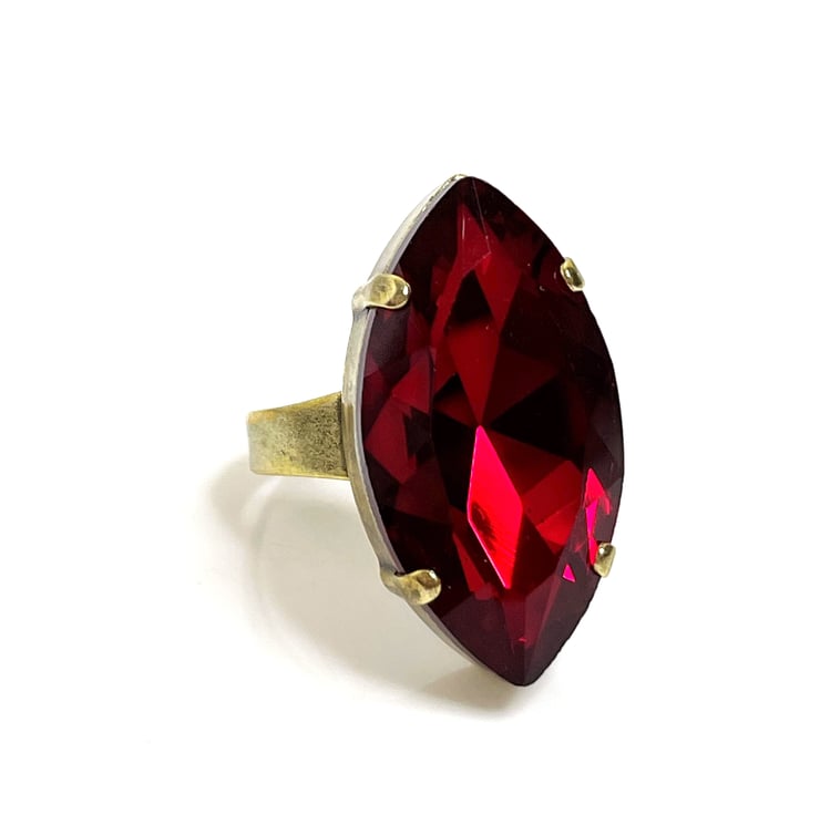 This lovely ring is created with a very bold 32mm x 17mm red colour navette crystal.