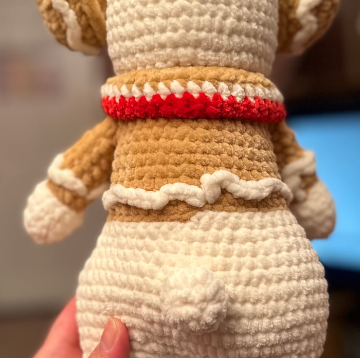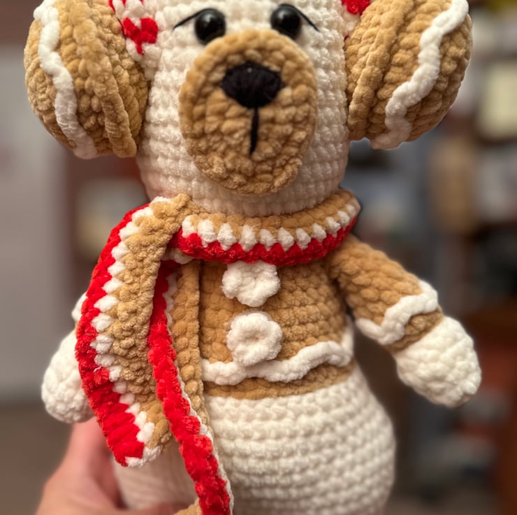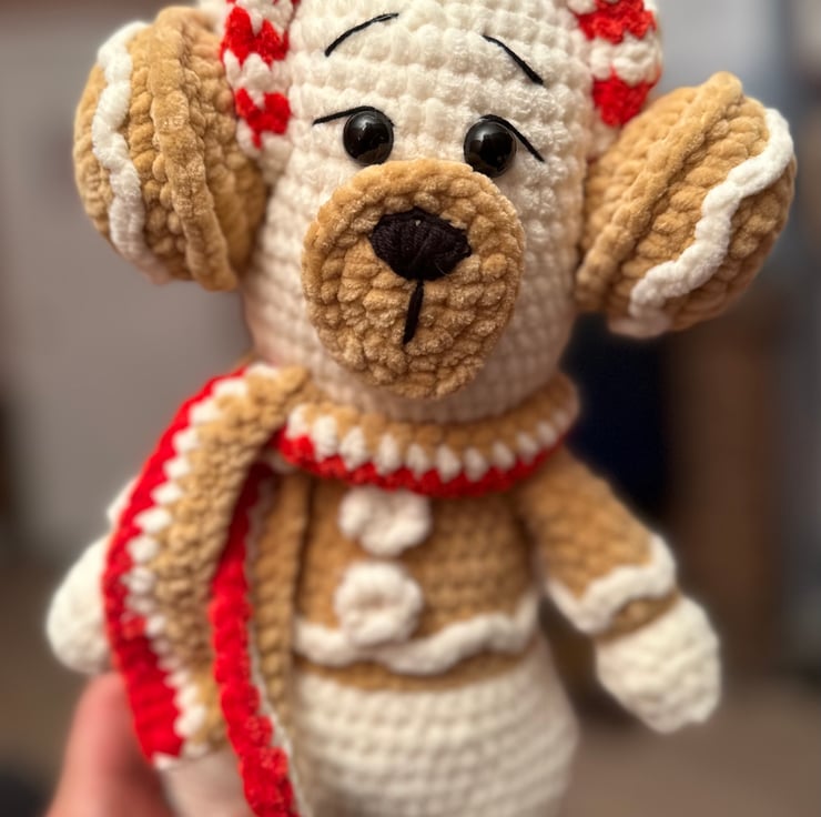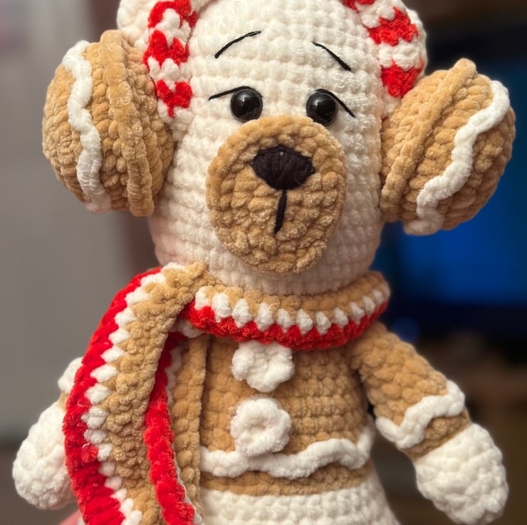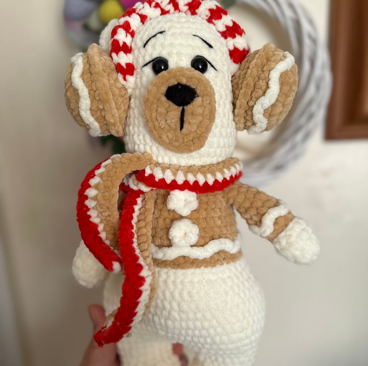 Handmade crochet Amigurumi soft plushie toy featuring a charming Christmas polar bear. This adorable polar bear stands approximately 35 cm tall and is crafted with high-quality, soft yarn for a gentle texture. It wears festive cookie and candy-colored earmuffs to keep warm during the holiday season, along with a matching cozy scarf . Perfect as a seasonal decoration or a cuddly gift.