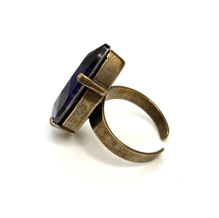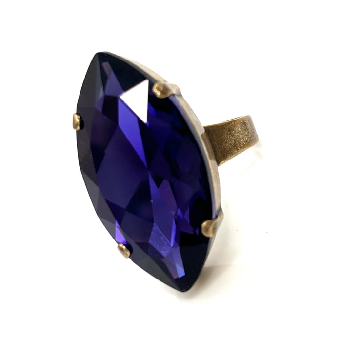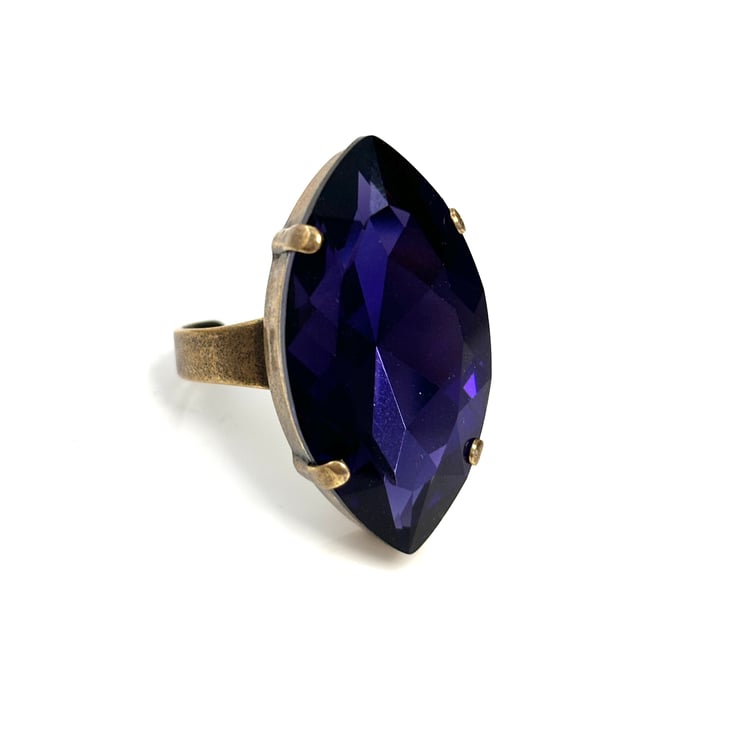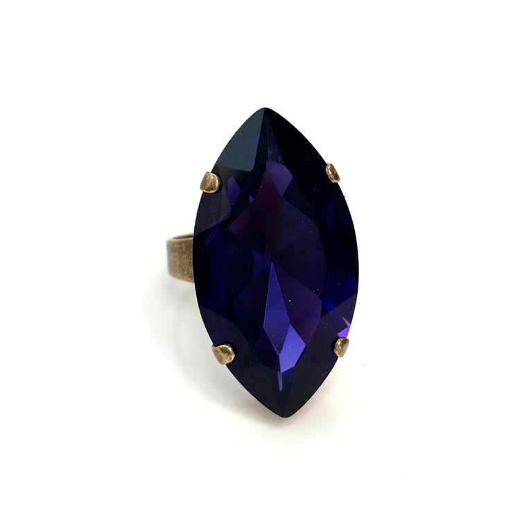 Beautiful very large Purple Velvet crystal navette antique brass ring