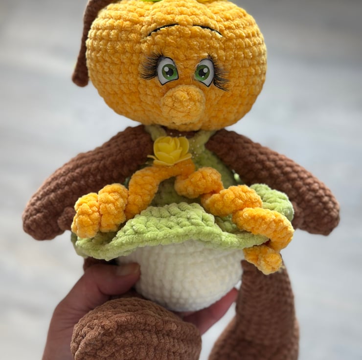Additionally, this delightful pumpkin features a beautifully crocheted dress adorned with a charming flower embellishments , adding to its overall appeal. Complete with a handmade tag and a lovely gift tag, this plush pumpkin makes for an irresistibly cute present for friends or family members, spreading joy and warmth during the Halloween season and beyond.