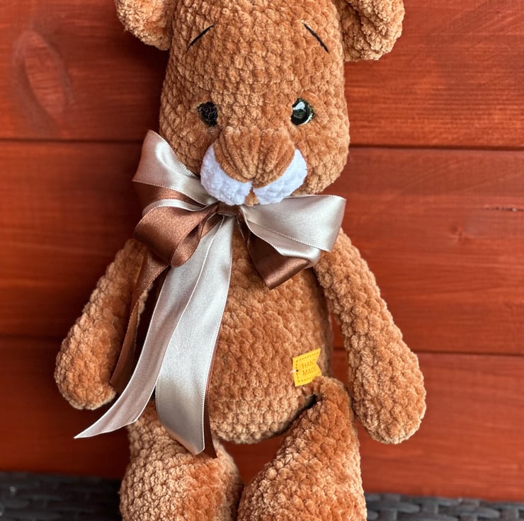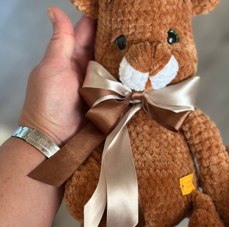 Introducing a beautifully handcrafted crochet Amigurumi plush toy designed in the delightful form of an endearing bear. This whimsical creation showcases a rustic brown hue that evokes the warmth and charm of nature, beautifully complemented by a stunning two-tone bow in rich chestnut and warm latte shades, which gracefully encircles its neck. This teddy bear exudes a playful yet sophisticated charm that invites endless affection and cuddles.