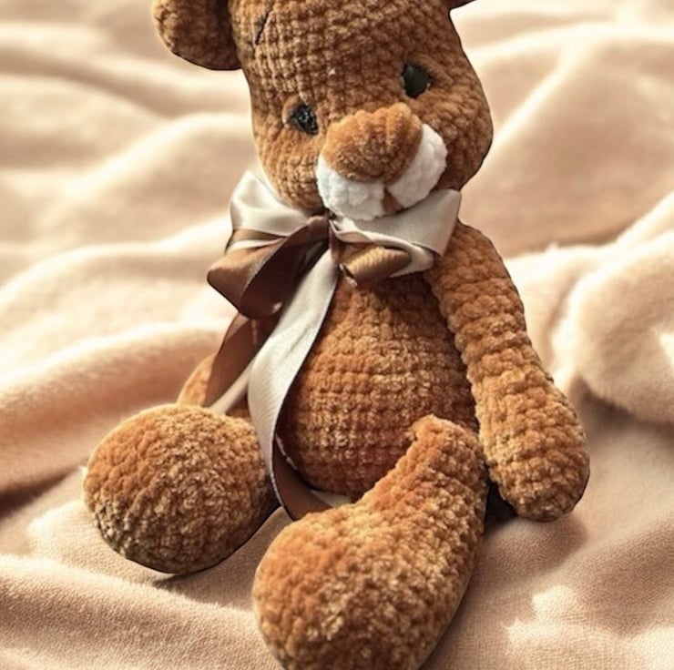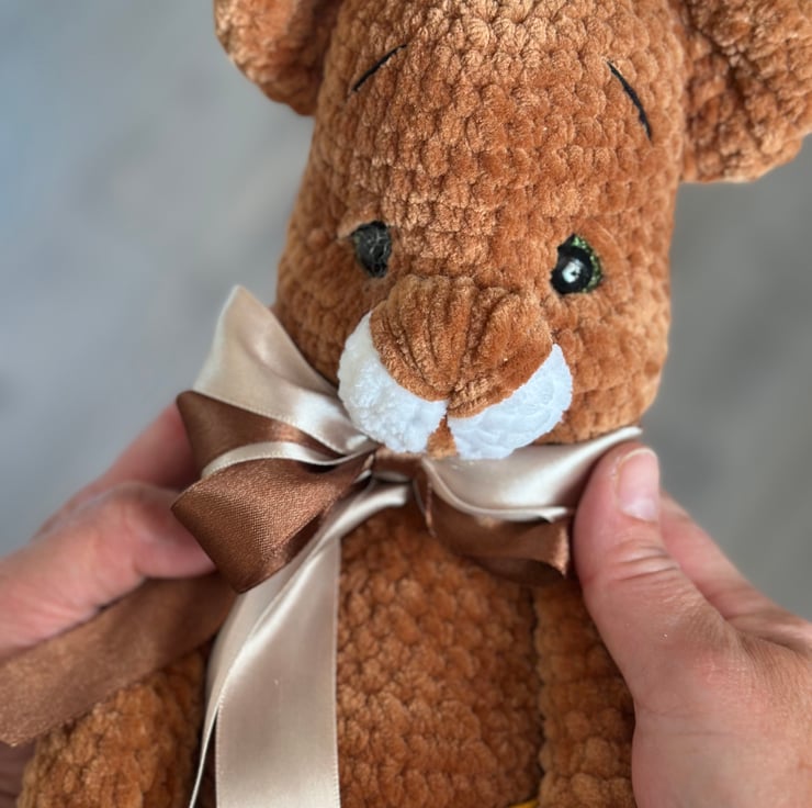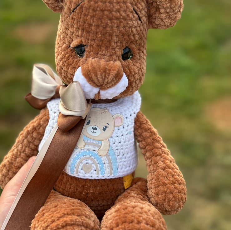 Additionally, an inserted plastic cotter pin and disk mechanism between the head and neck allow the teddy bear to move its head from side to side, enhancing its playful personality. With its unique and enchanting design, stunning craftsmanship, and sumptuous texture, this Amigurumi teddy transcends the ordinary; it becomes a cherished keepsake that promises to bring joy, warmth, and lasting memories for years to come.