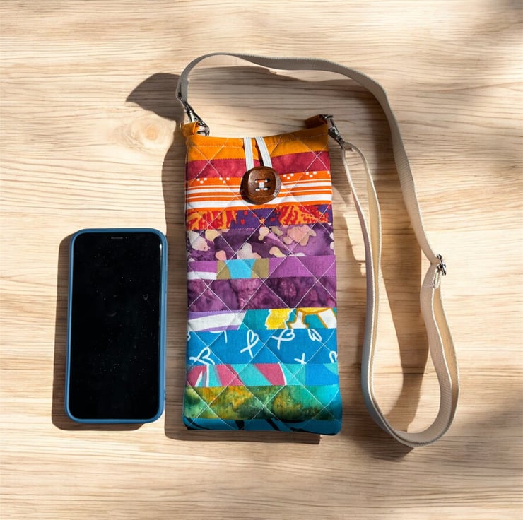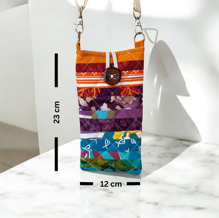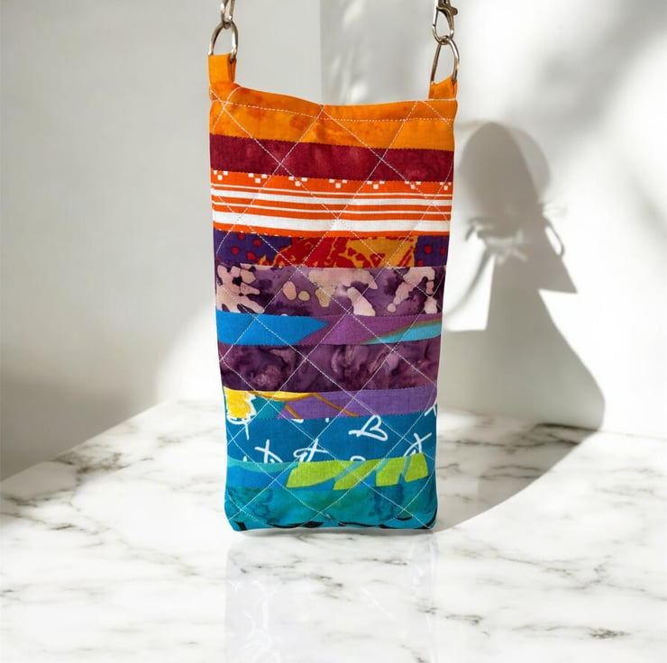 Introducing our vibrant patchwork iPhone crossbody bag—a must-have accessory for anyone on the go! This bag boasts a fun mix of bright colors that’s sure to catch the eye and add a pop of personality to your outfit. Designed with practicality in mind, it’s the perfect size to hold your essentials like keys and credit cards, keeping everything conveniently at your fingertips.