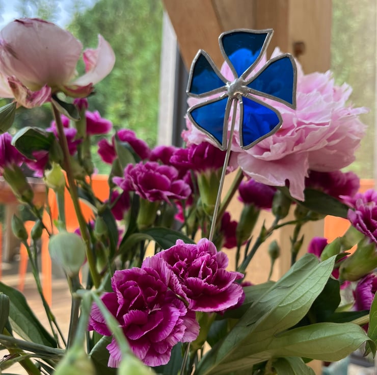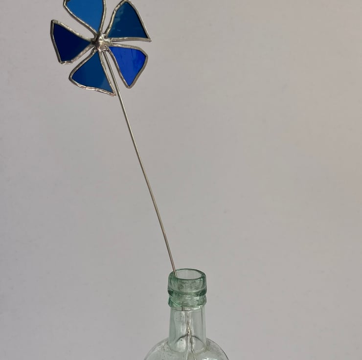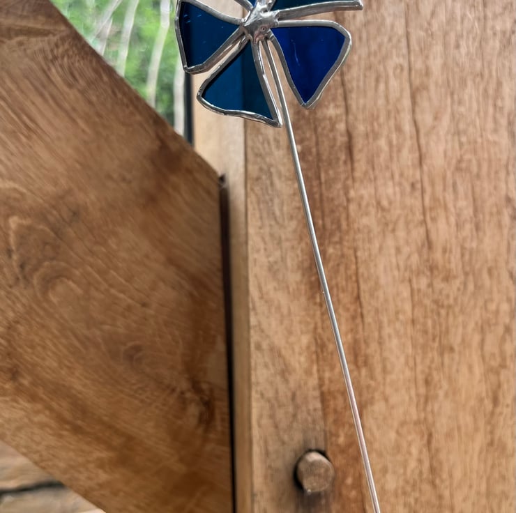 A beautiful blue five petalled stained glass flower on a wire stem. The triangular petals are in two shades of deep blue and fan out from a silver solder centre.