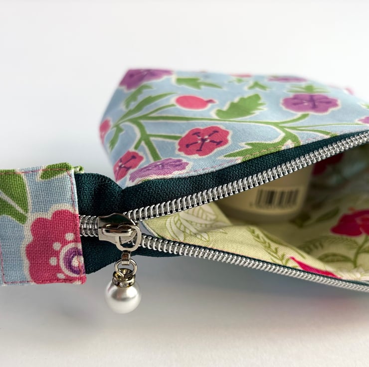 Made from a cotton fabric exterior with a completing floral fabric lining. The purse is closed with a zip which has a pearl effect zip pull.