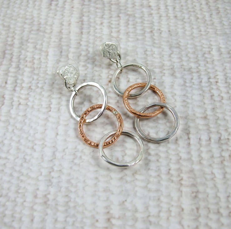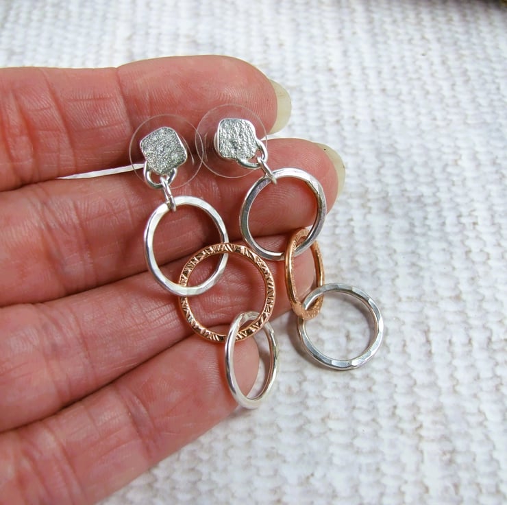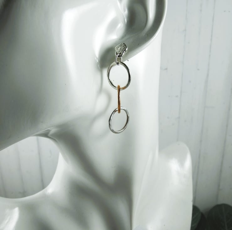 I have created the circles from 1.5mm silver and copper wire, hand cut, shaped and soldered together. The stud fittings are made from silver sheet with a small loop and posts soldered on and I have given all the components different textures with hammers and hand tools.