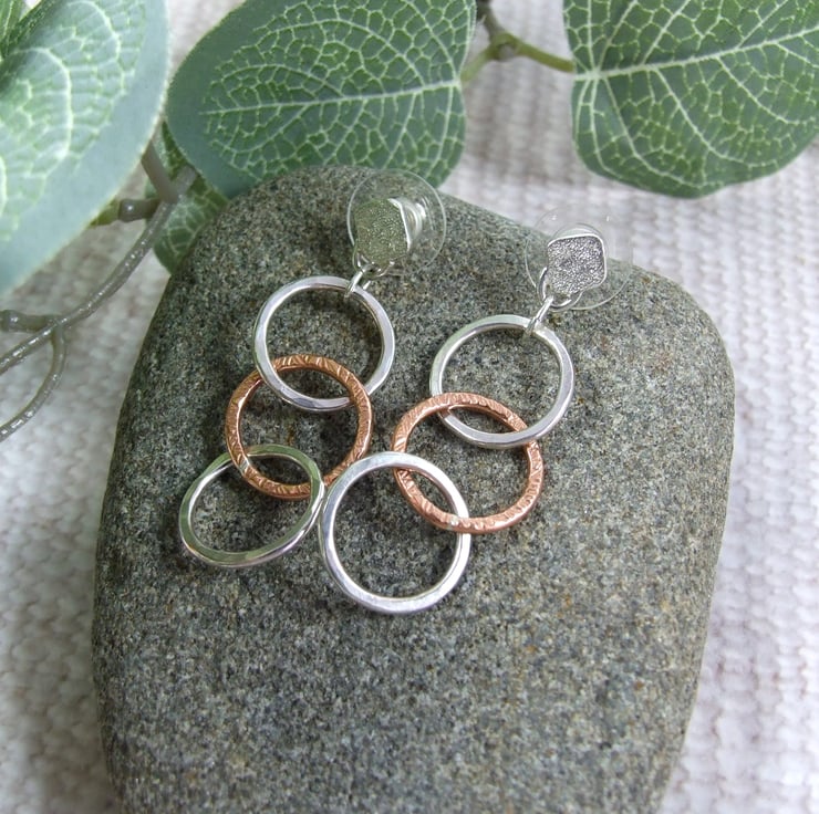 Silver and copper circle dropper earrings. Sterling silver stud fitting.