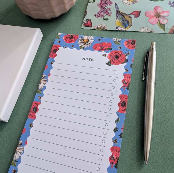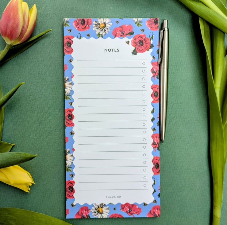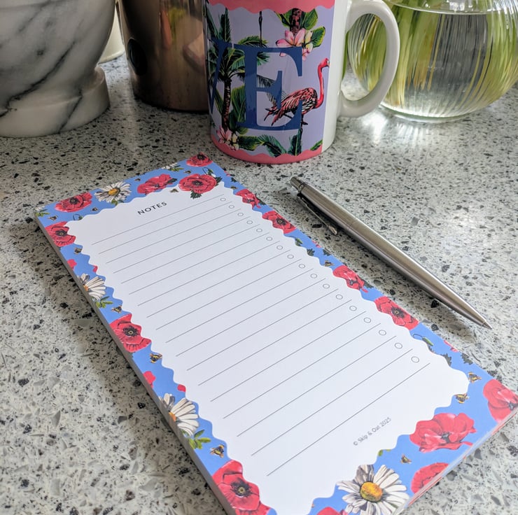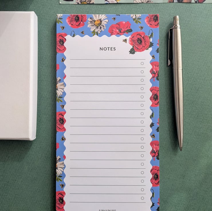 My luxury hand-painted Poppy To Do List brings the colour and beauty of nature to your daily planning, shopping lists and home office. It is not just a functional planner, it's a beautiful piece of art. Created by me, Katy Hardcastle, founder of Skip & Oat, this notepad features my delicate hand-painted poppies, daisies, and buzzing bees in vibrant acrylics, inspired by the natural beauty of Sussex, where I live by the sea.