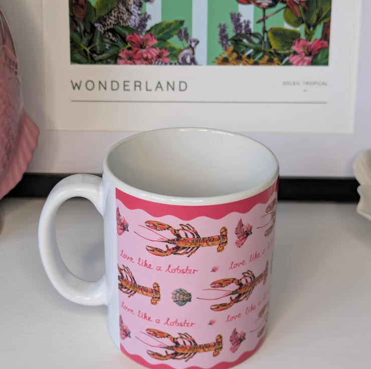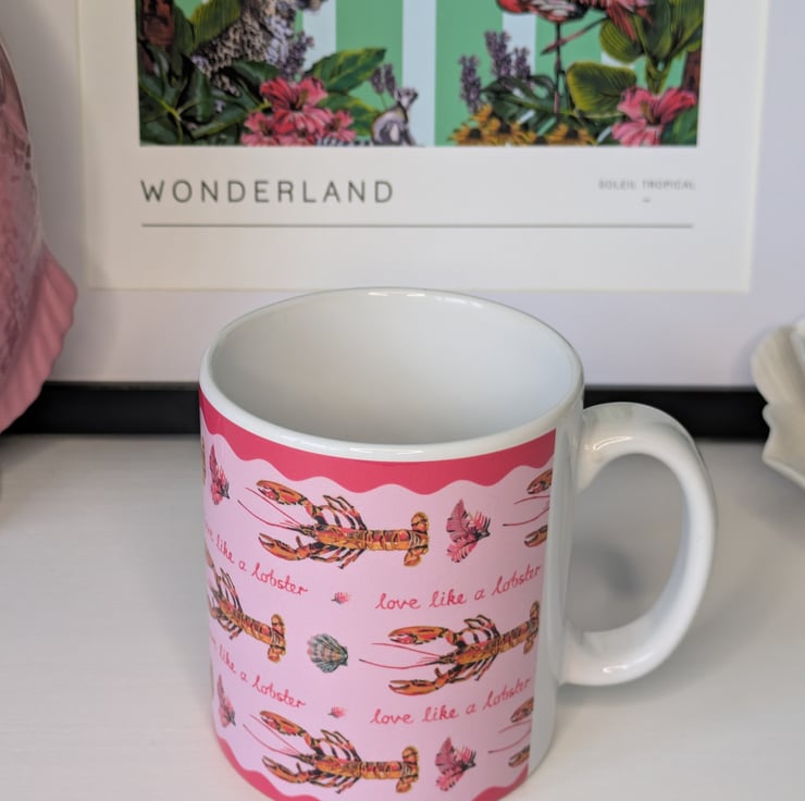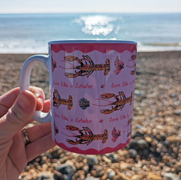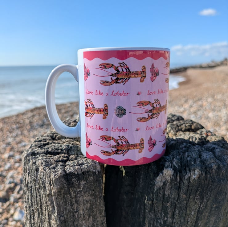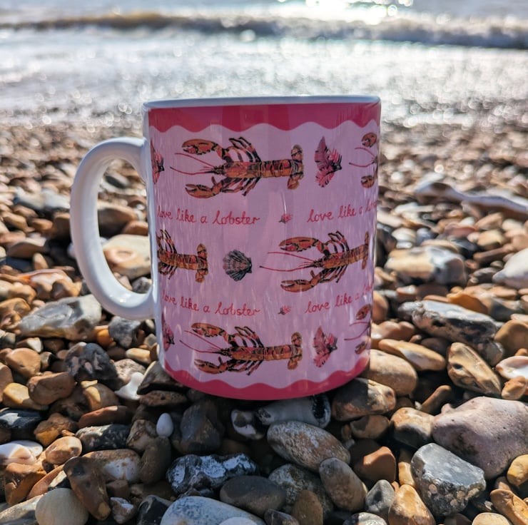 The design features my original hand-painted artwork by me; Katy Hardcastle, British artist, print designer and founder of Skip & Oat, created in my studio on the South Coast of Sussex. The print showcases my water colour handwriting, acrylic paintings of charming lobsters, seashells and pink seaweed, set against a soft blush pink background with a bold pink wavy border that wraps around the mug.