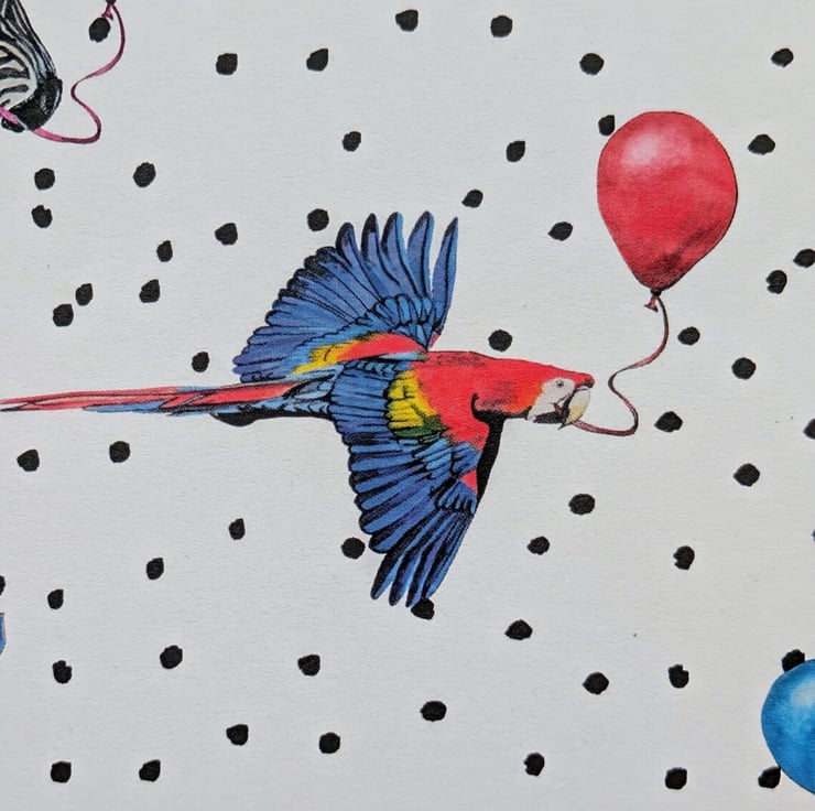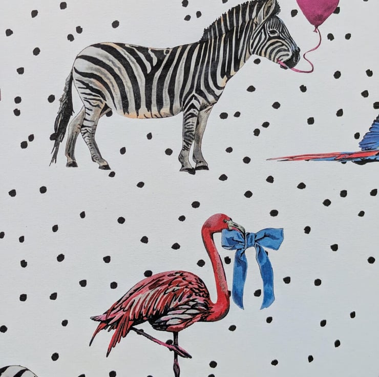 This playful design is bursting with flamingos, parrots, zebras, swallows, and hummingbirds, all coming together to create a joyful birthday celebration scene. The perfect spotty background ties it all together, making your presents pop with personality.