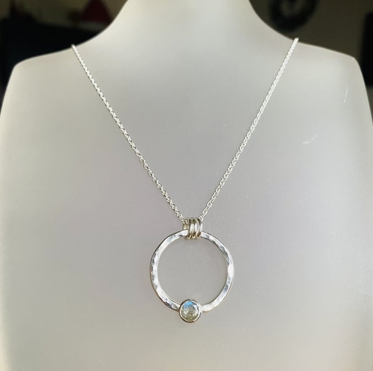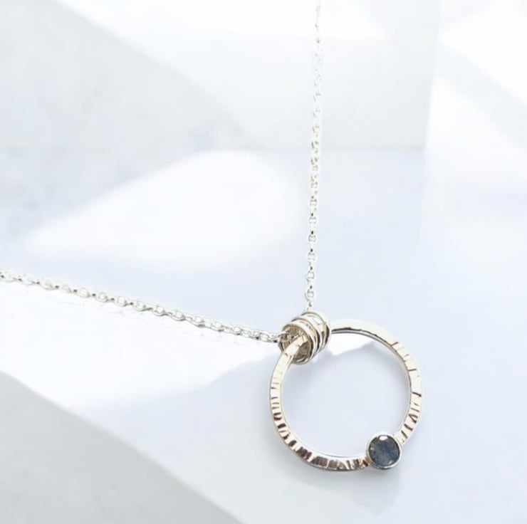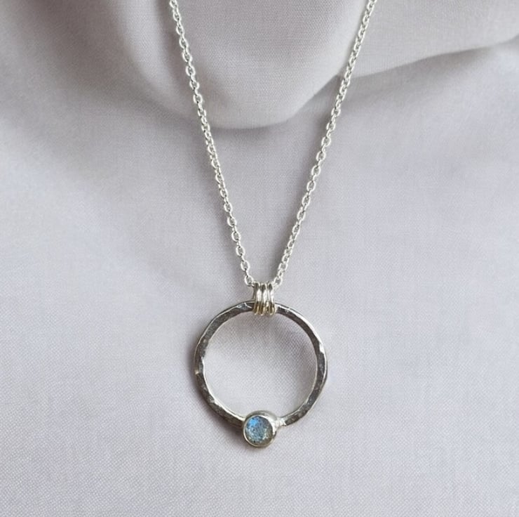 This handmade sterling silver necklace has a textured circle with a tube set Labradorite stone. Labradorite is a beautiful stone with shades of grey, blue and green. It looks like a neutral colour but as you move the light catches the flashes of colour. The piece is attatched to a sterling silver trace chain with three rings. It will be easy to wear with many different outfits and will soon become a favourite piece.