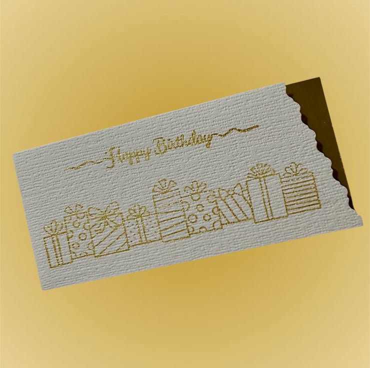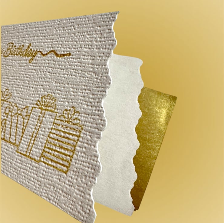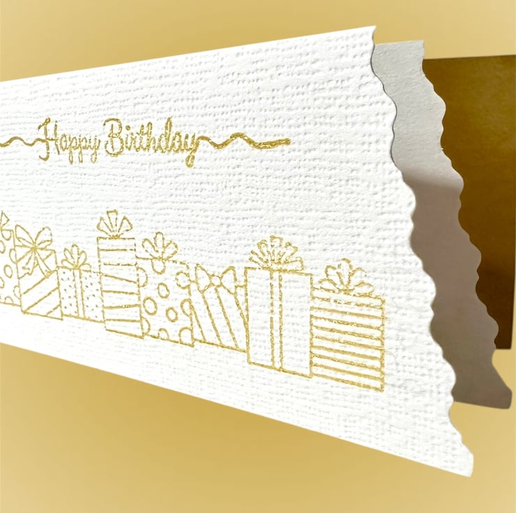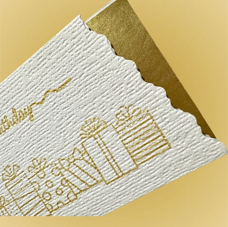 The message “Happy Birthday” sits above a row of beautifully wrapped gifts, both hand printed with a gorgeous gold metallic ink with a shimmer.