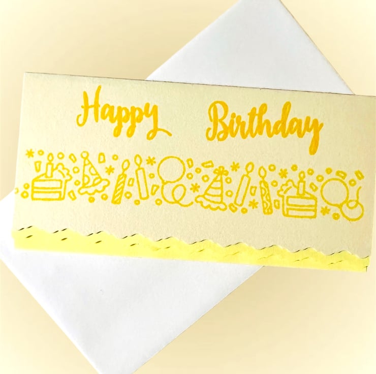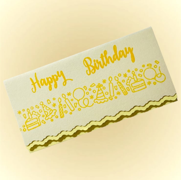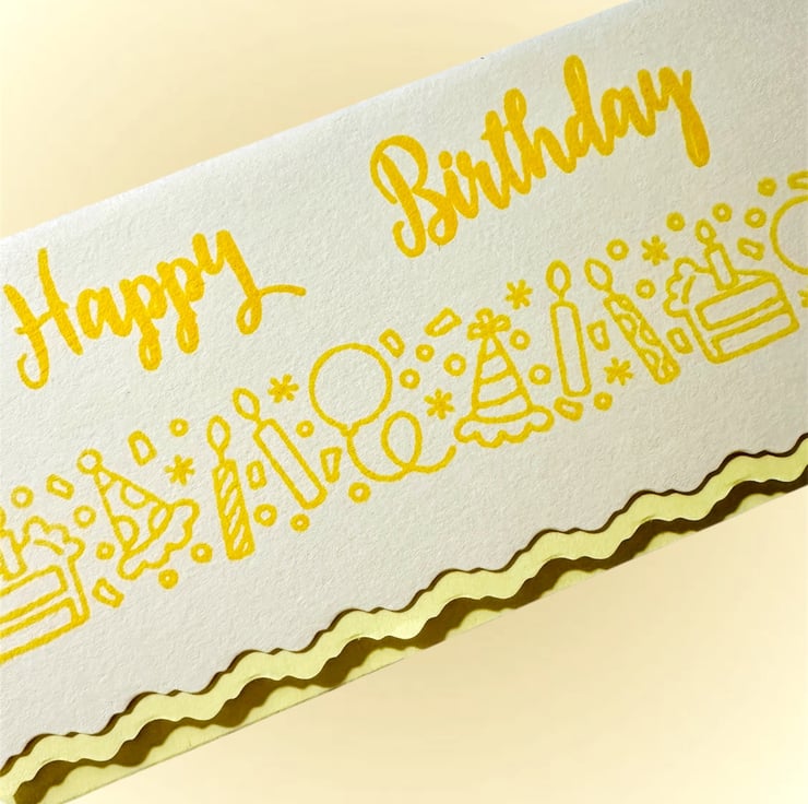 The message “Happy Birthday” sits above a row of party themed hats, candles, cake and balloons. All hand printed in a deep yellow ink.