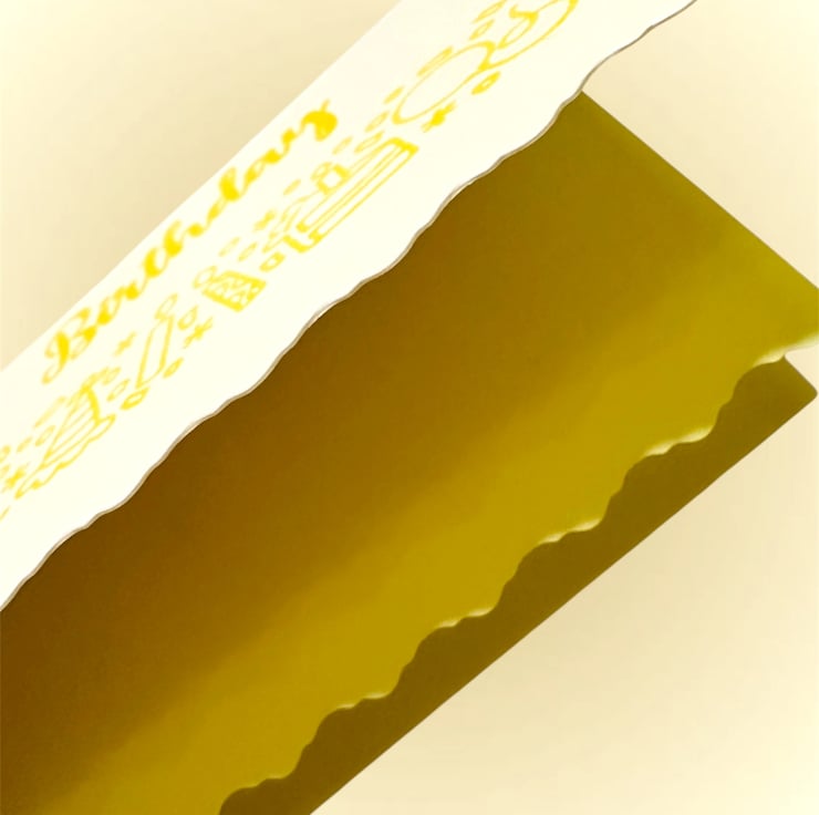 A bright and cheerful card which has been hand printed using archival inks onto high quality, textured, acid free, heavy card stock in soft cream. A pretty patterned wavy cut along the bottom edge lets the matching pastel yellow insert show for added layered effect.