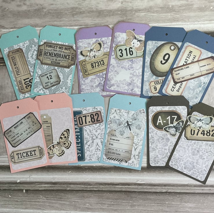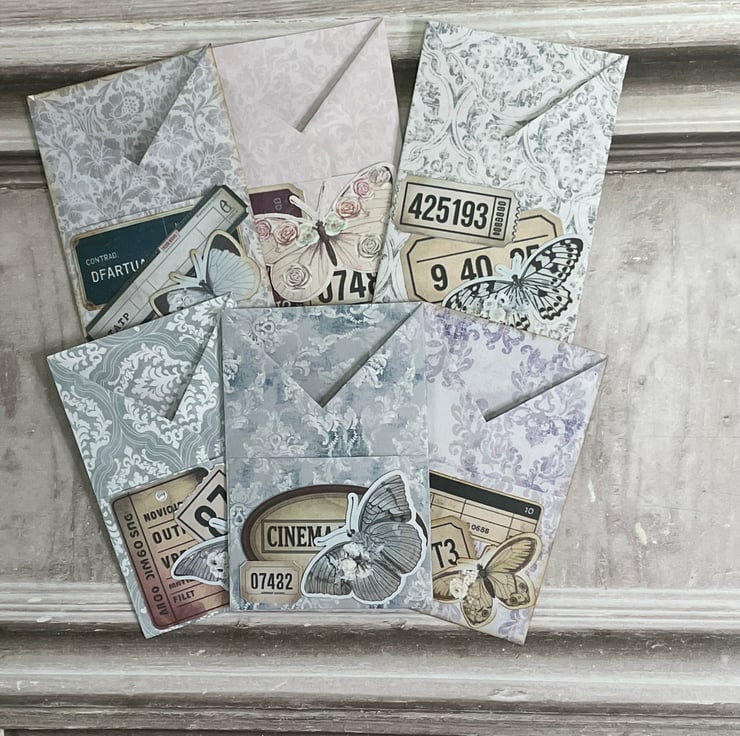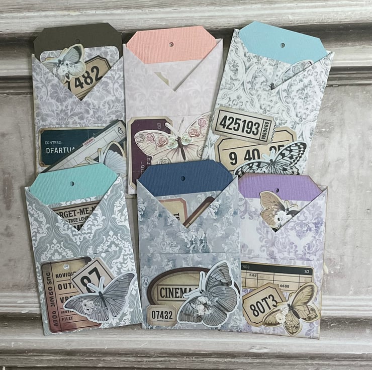 6 Pretty wrapped pockets holding 2 tags, an additional pocket o the front for your own ephemera. The tags have the same design on the front along with various vintage style ephemera to decorate. The front pocket has also been decorated, including a butterfly. Each pocket measures 4" x 2.5", Tags measure 2 3/8" x 21/8" Perfect as an addition to a journal to gift.