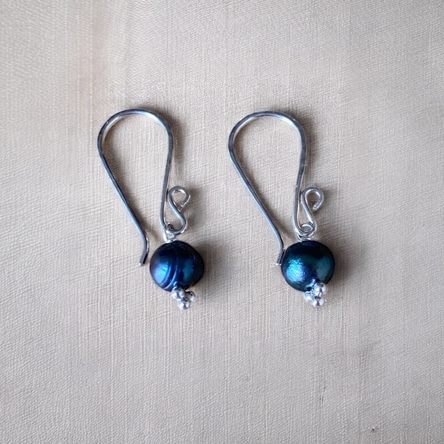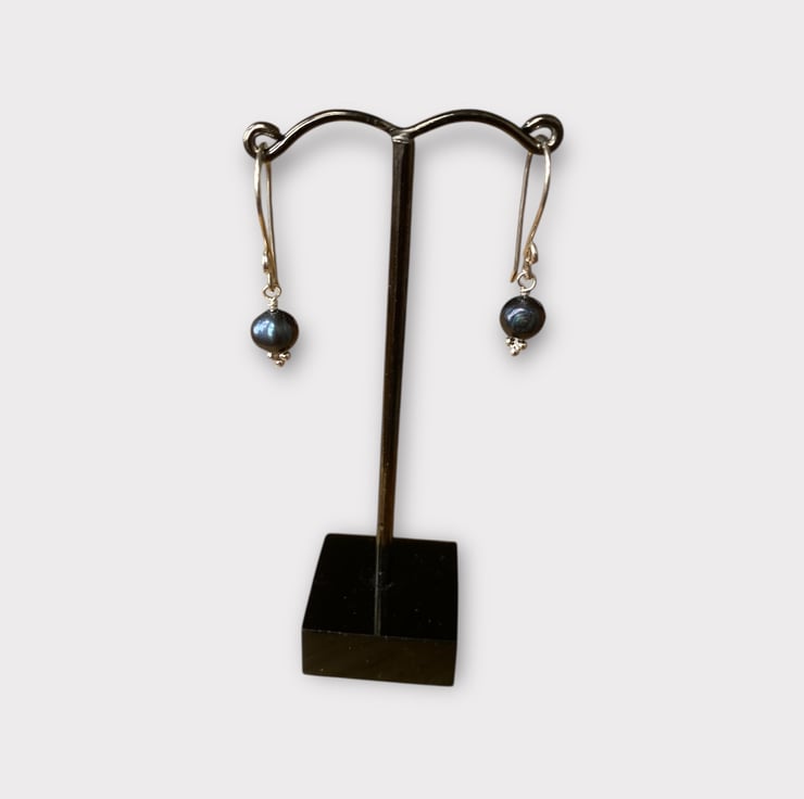 Elegant pearl earrings in a simple drop design. These earrings have a single freshwater pearl in a choice of white or dark blue. The pearl is threaded onto a three ball headpin and hangs from an elegant swan earwire. They are simple but elegant earrings - the perfect accessory to any outfit.