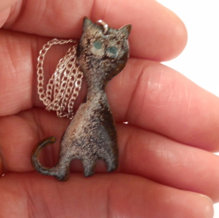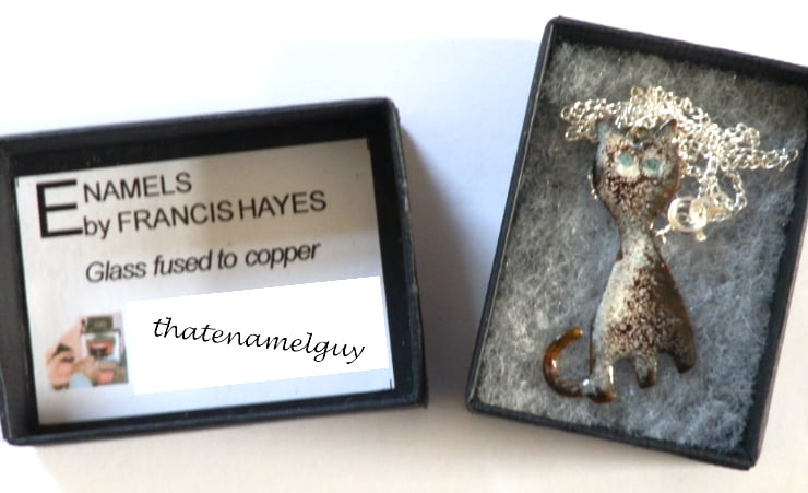 This cat is decorated with layers of dark brown and white enamel over the copper base.