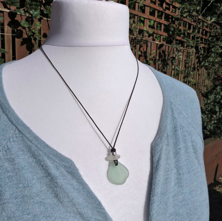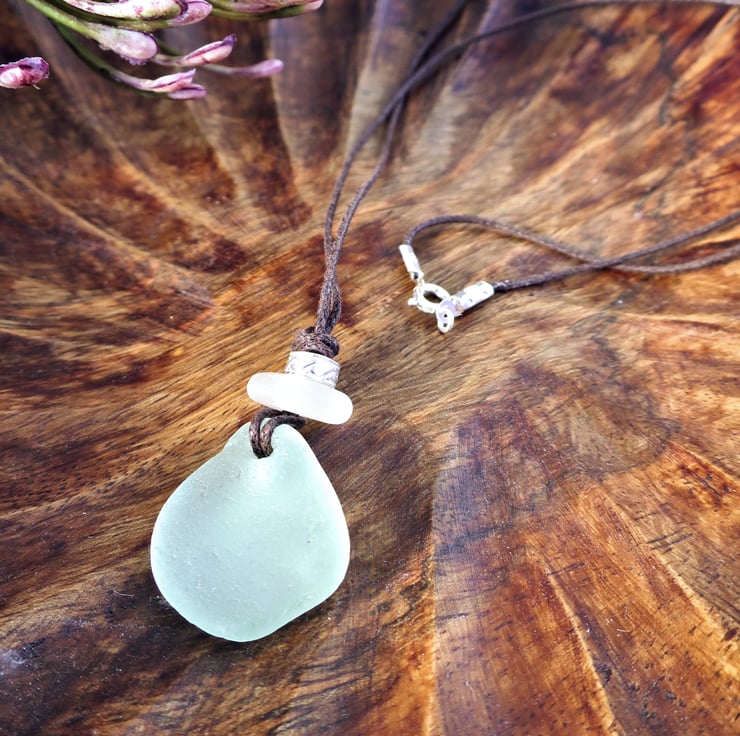 Seafoam Sea Glass Necklace, Handmade Coastal Pendant on Waxed Cord