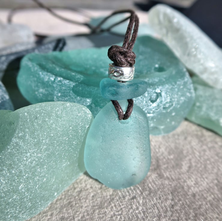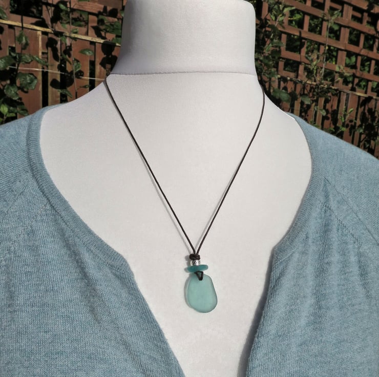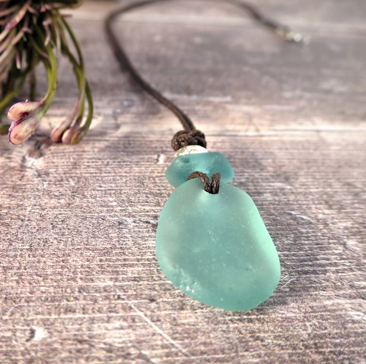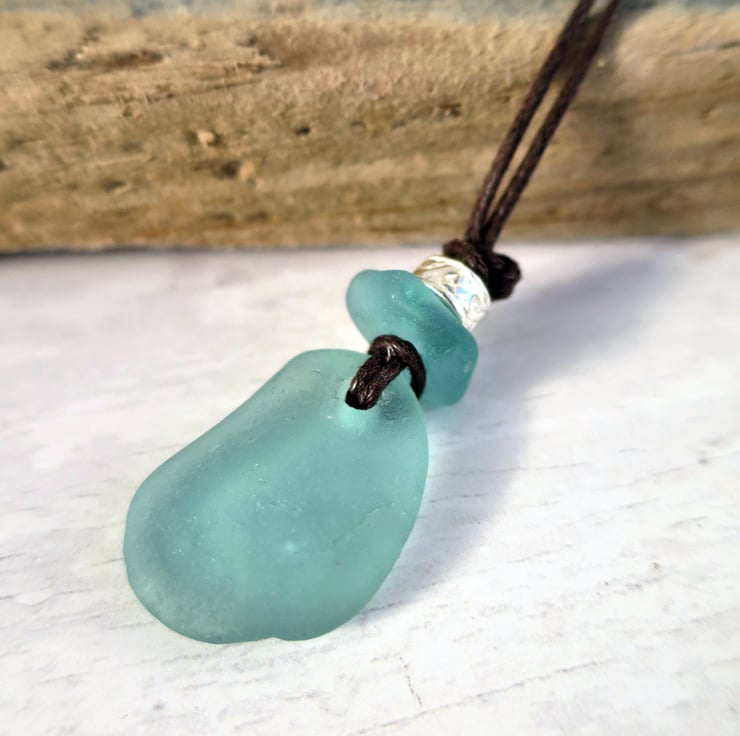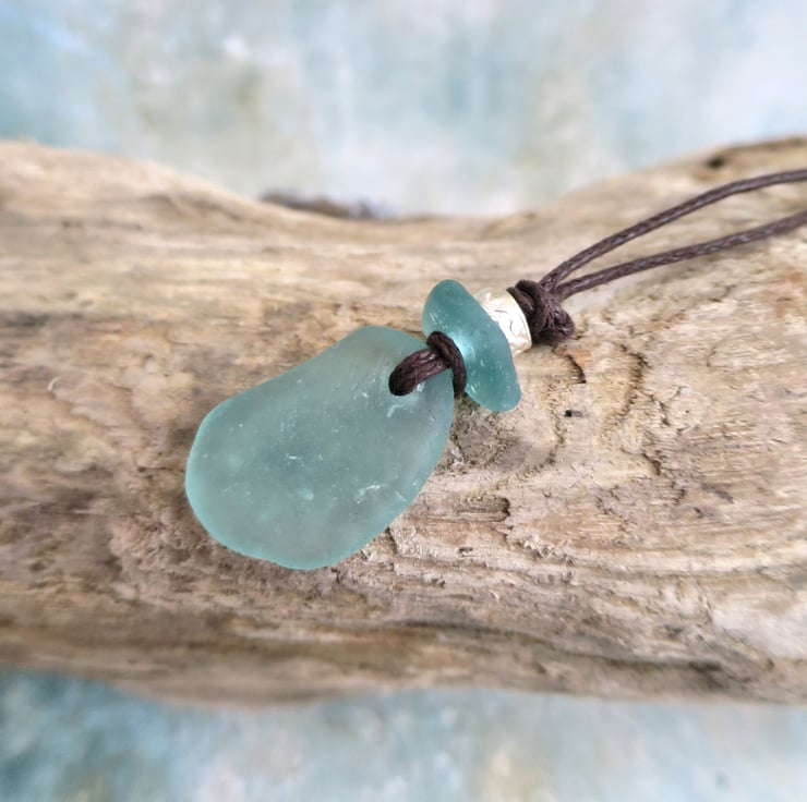 Aqua Sea Glass Pendant, Handmade Coastal Necklace on Waxed Cotton Cord