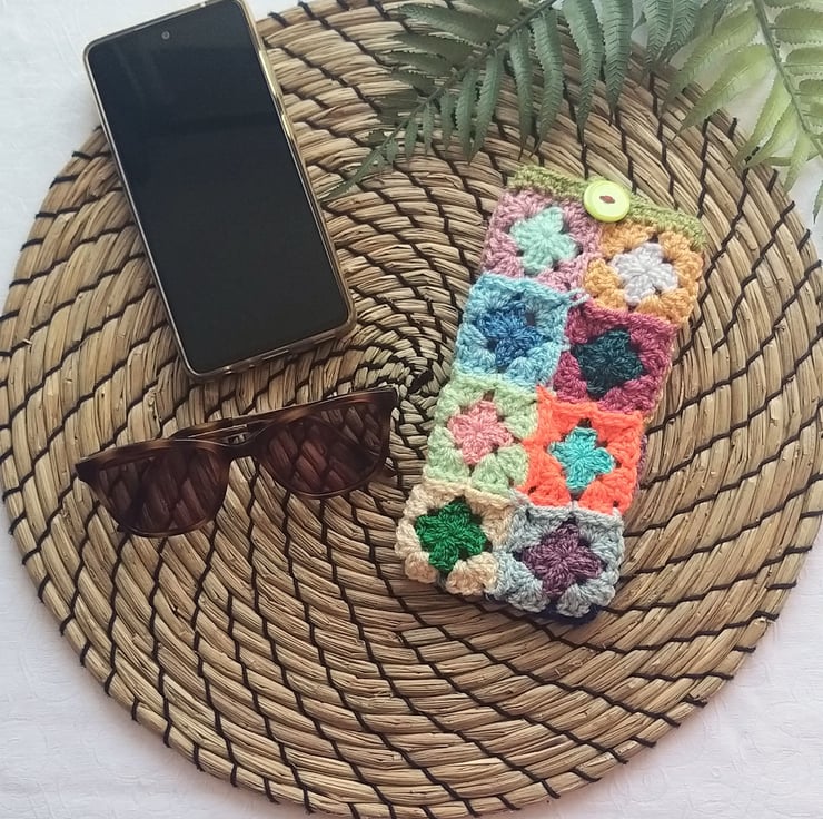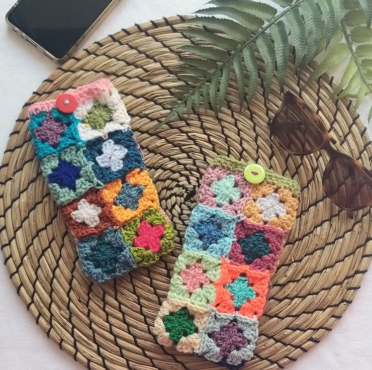 These cases are a fun way to stop scratches to your sunglasses or regular reading glasses while they’re in your bag or pocket. Made with a squishy yarn to cushion the glasses with a loop and button fastening. They can also hold a mobile phone too!