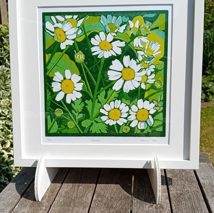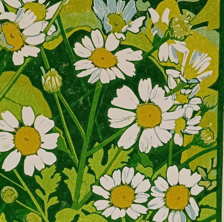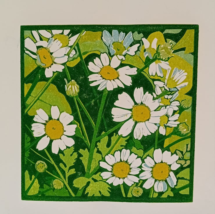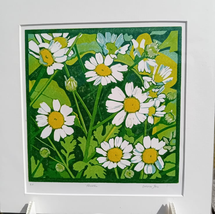 A limited edition Linocut print of feverfew daisies.