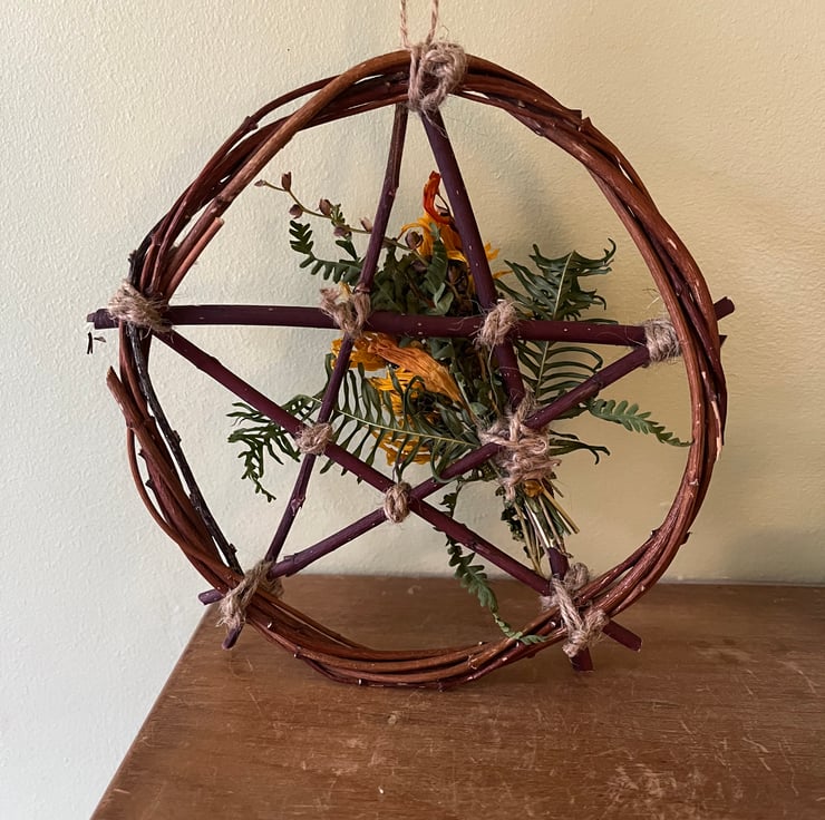 A handmade dried flower pentagram decoration measuring approximately 16cm in diameter.