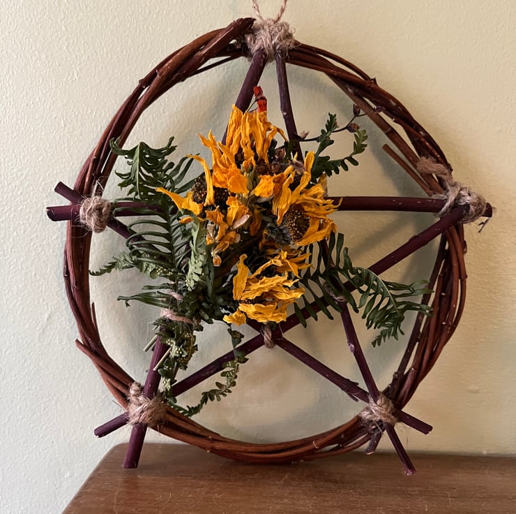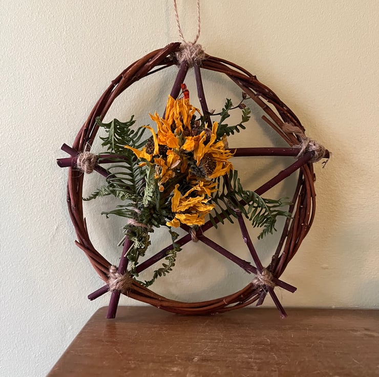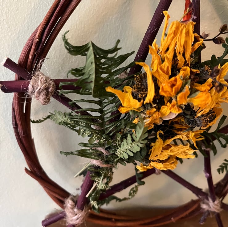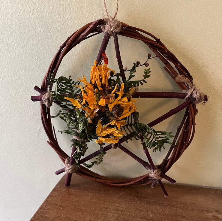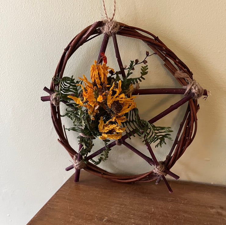 Dried Flower and Foliage Pentagram Decoration. 16cm Diameter.