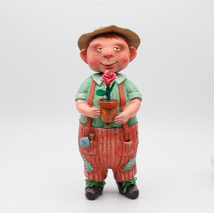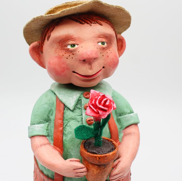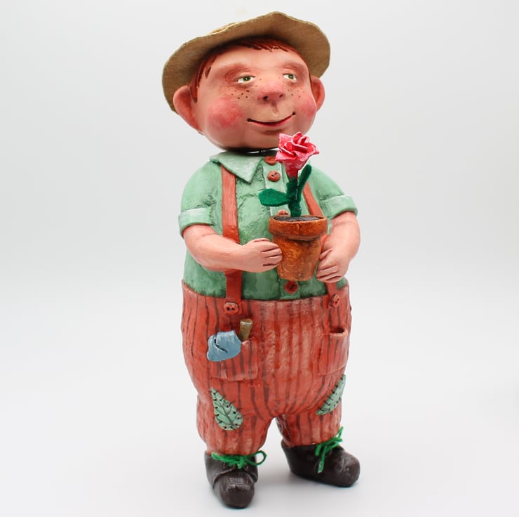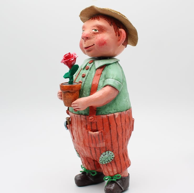 Meet Leo the Gardener – a charming, one-of-a-kind art doll crafted in a vintage style. Handmade from paper clay, painted with acrylics, and sealed with protective varnish. His head gently moves, bringing more personality to this whimsical character. Leo is dressed like a gardener from a forgotten storybook, full of warmth and quiet humour.