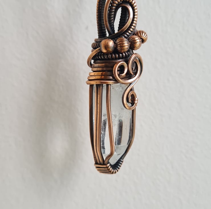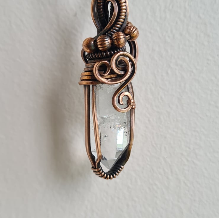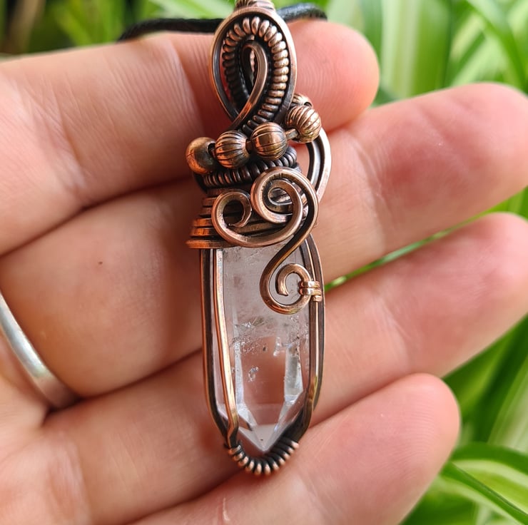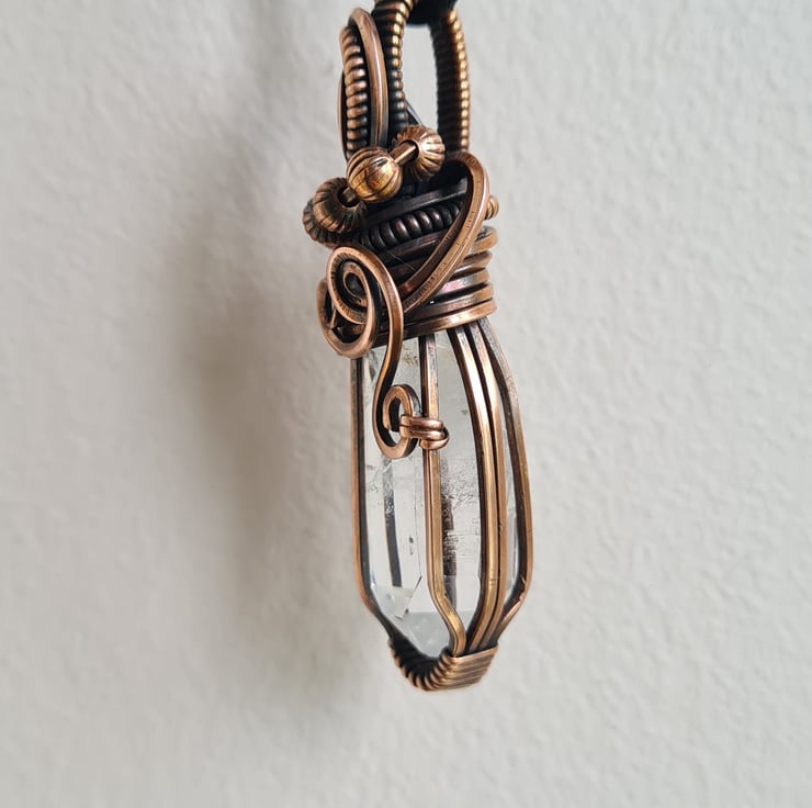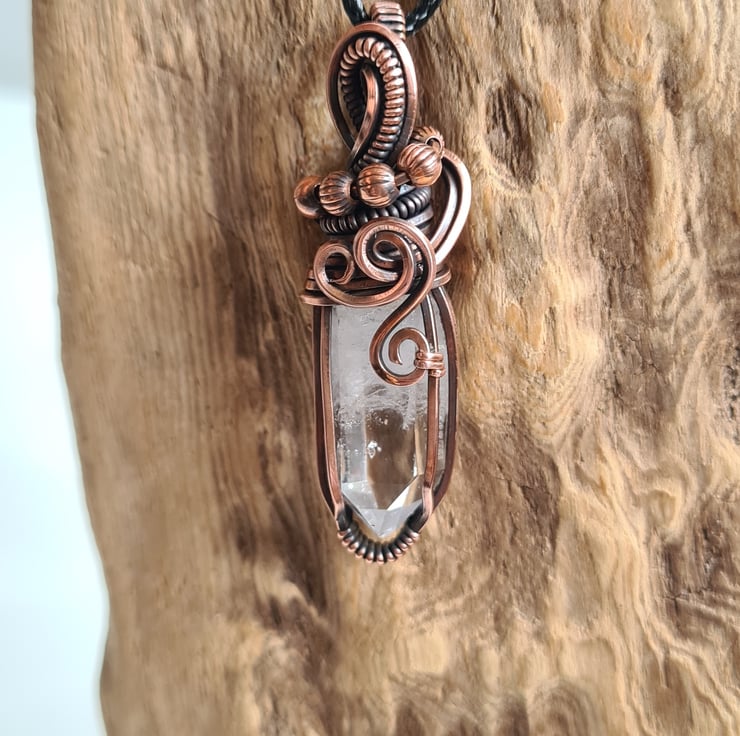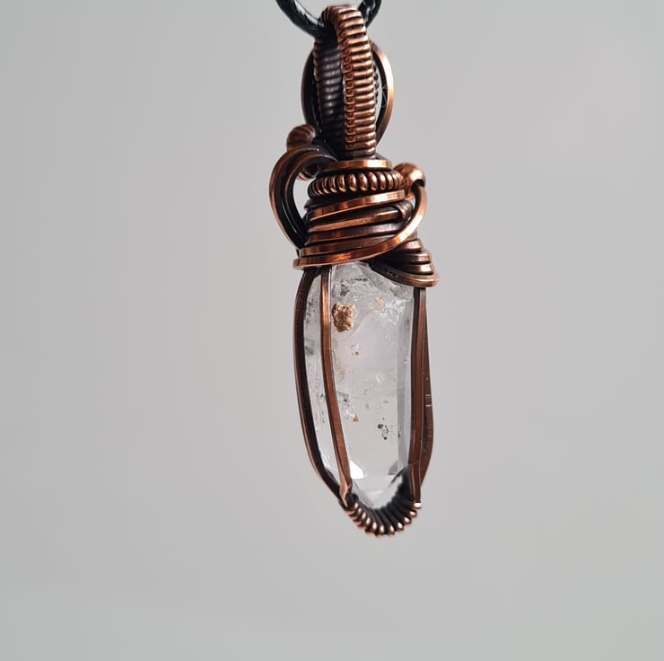 I have created this unique pendant using this Natural Raw Brandberg crystal which is exactly as it was when it was pulled from the ground, and I have wrapped it with copper and then antiqued and polished for the final effect. This crystal is beautiful and has a gorgeous clear quartz colour and so natural that it even has some matrix stone still attached in places.