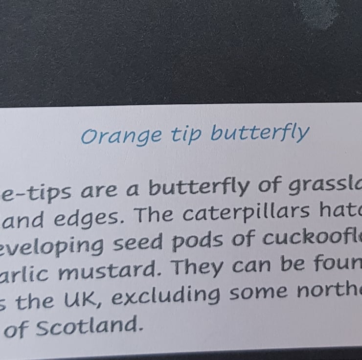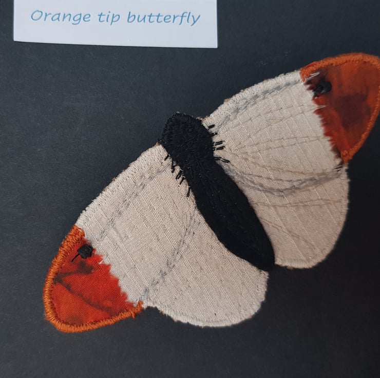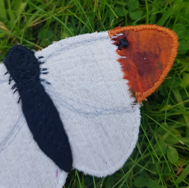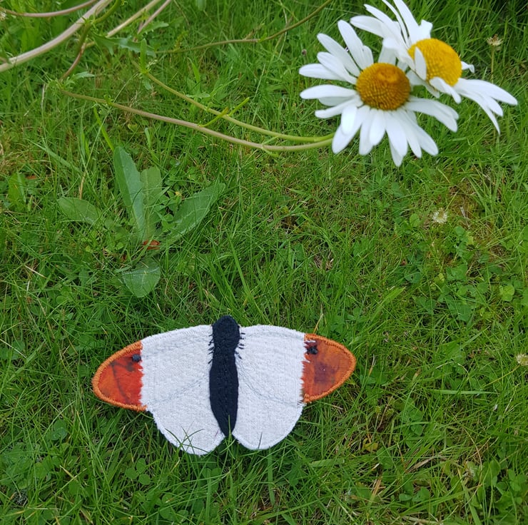 This textile brooch is made by stitching silk sari ribbons and remnants onto hessian. I have tried to produce a likeness to the orange tip butterfly. These are most common in grasslands and woodland edges. A little information about them and their habitat is included.