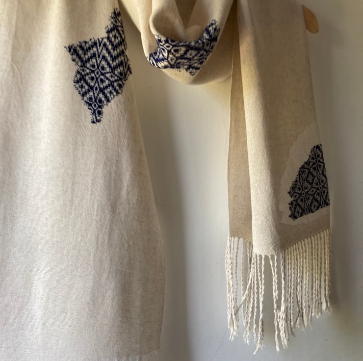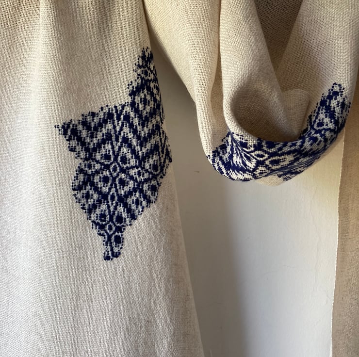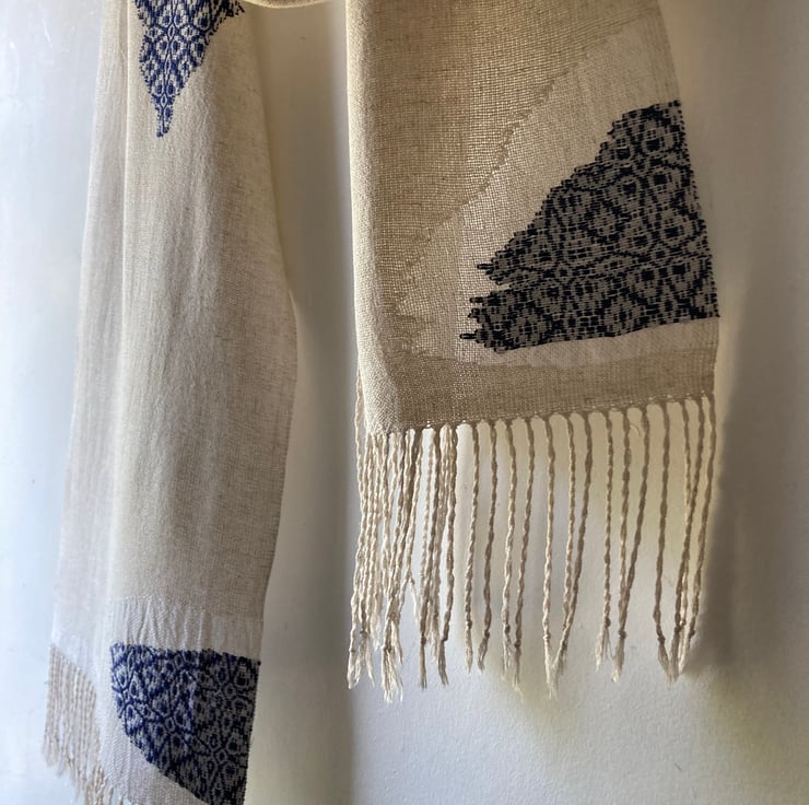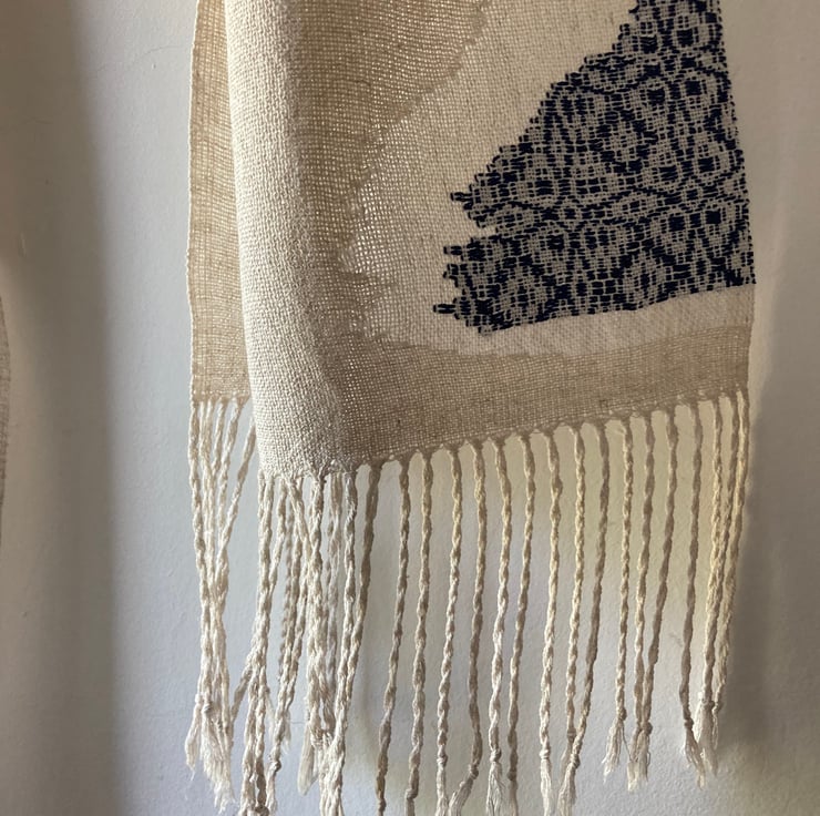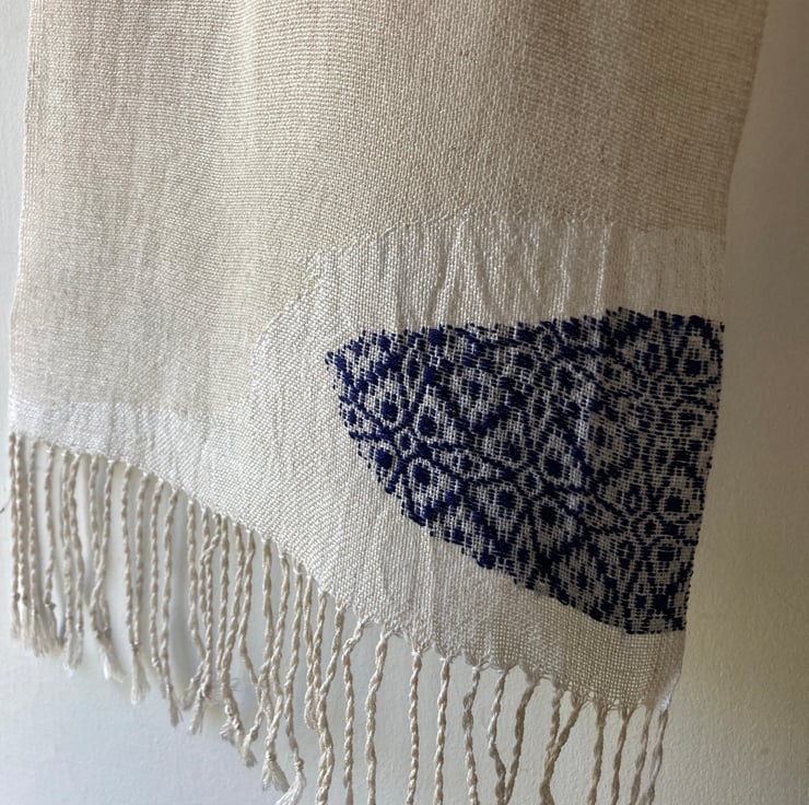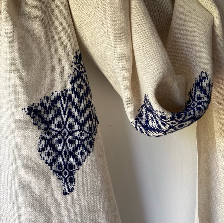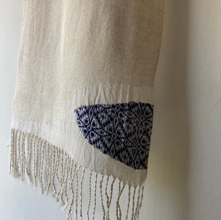 A handwoven natural, unbleached cottolin scarf with inlays of white linen and blue silk in a tiny overshot pattern. Created in response to coastal erosion at Robin Hood’s Bay, materials returning to the earth, and sea pottery washed to the tideline. The scarf features an intricate overshot pattern that echoes transfer-printed pottery. Traditionally finished with a steam press to create a supple and very light drape.