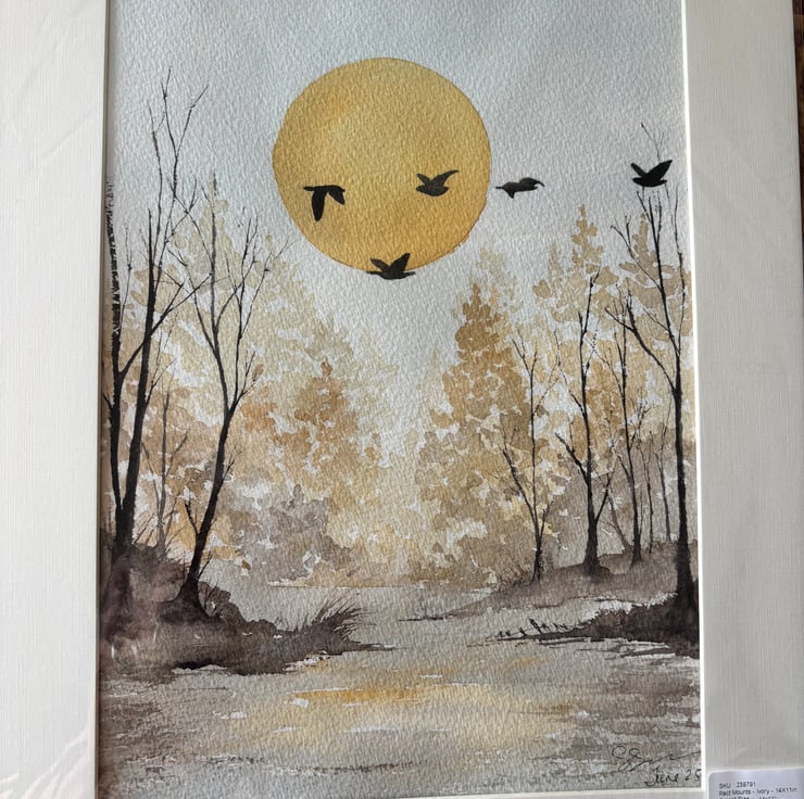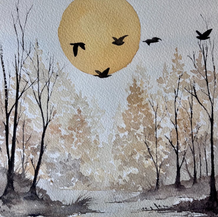Beautiful tranquil original watercolour capturing the beauty of the day as birds migrate. This is painted on wonderfully textured 9” x 12” Arches Rough watercolour paper