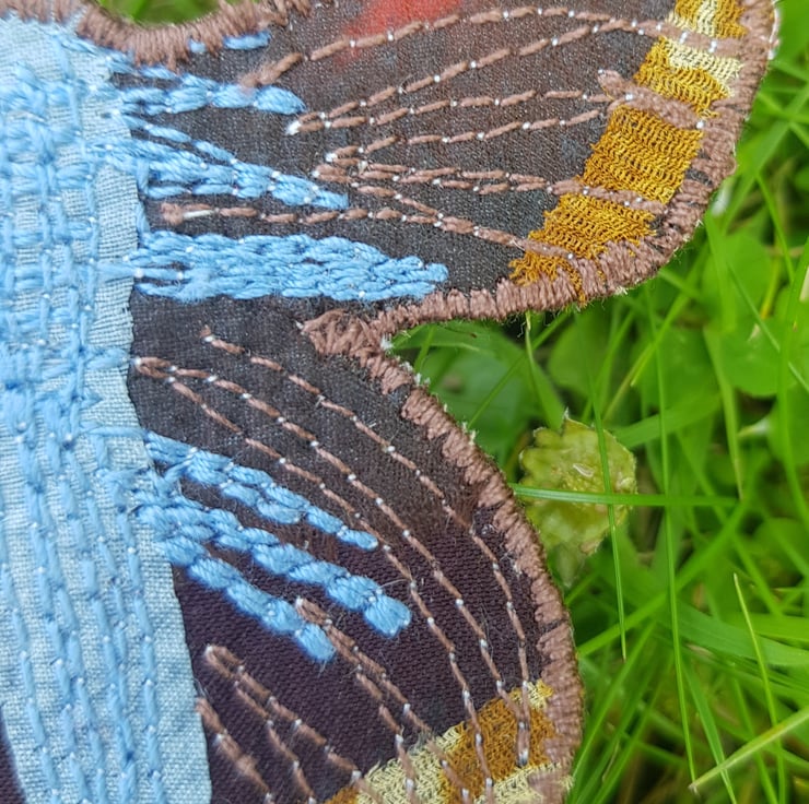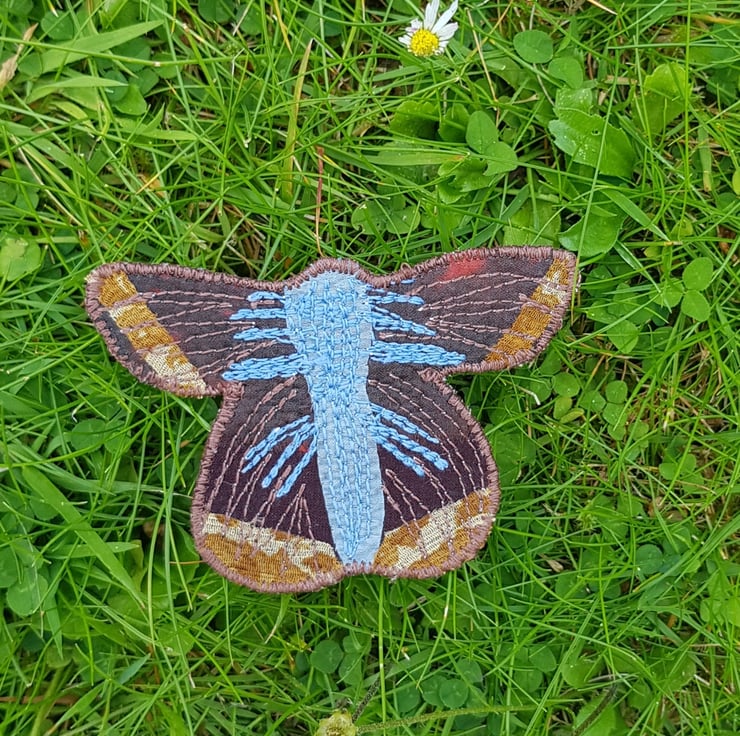 This textile brooch is made by stitching silk sari ribbons and remnants onto hessian. I have tried to produce a likeness to a female common blue butterfly, found in a variety of grassland habitats.
