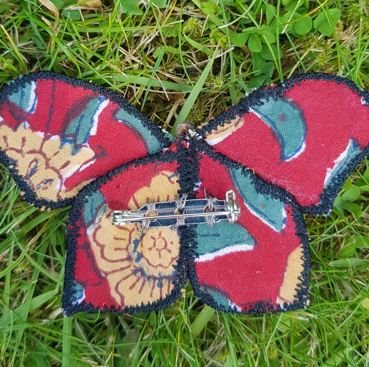 Each brooch is backed with a coordinating cotton and the brooch bar has a safety catch. Approx size 9 cm at the widest point x 5 cm